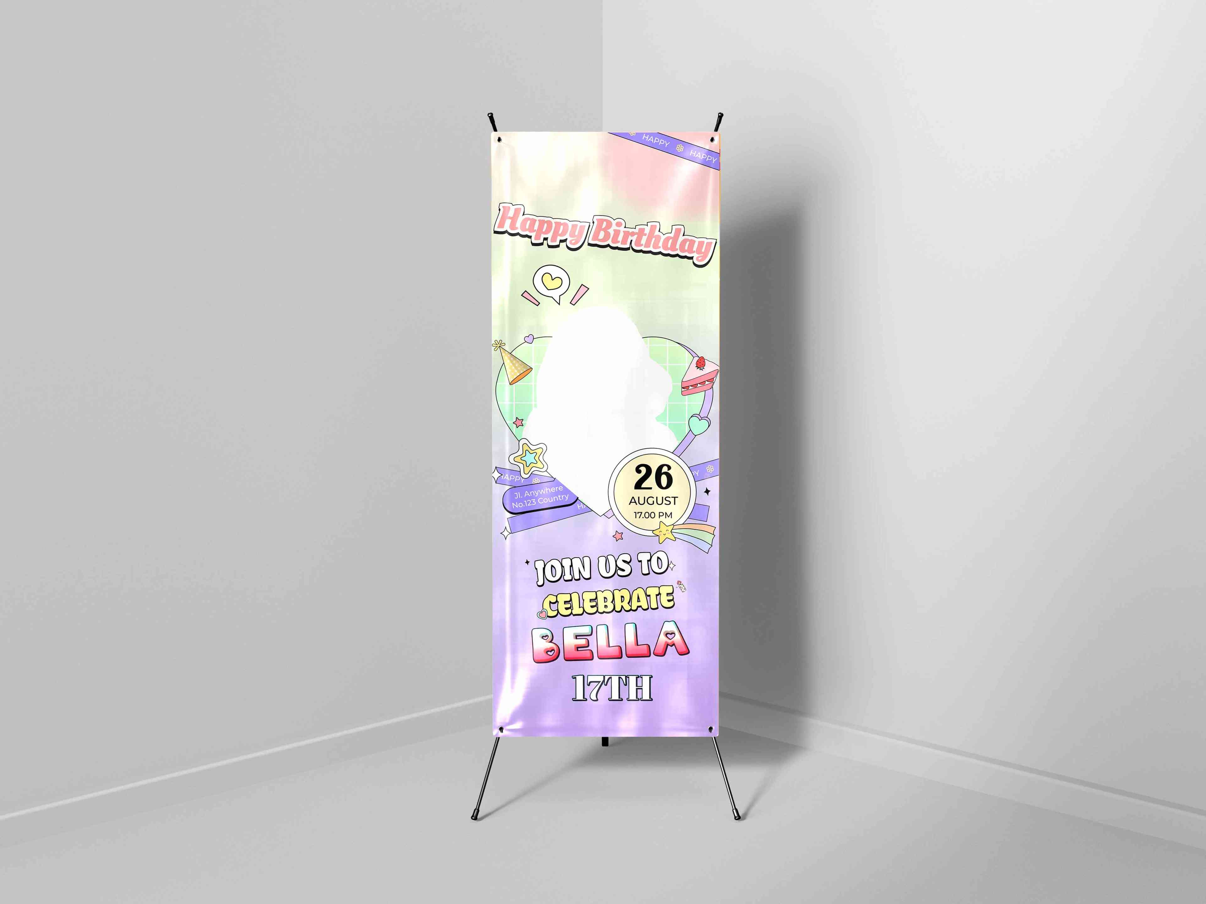 Desain X-Banner ini dirancang khusus untuk merayakan ulang tahun ke-17 dengan sentuhan warna pastel yang lembut dan ceria. Elemen grafis seperti binta...
