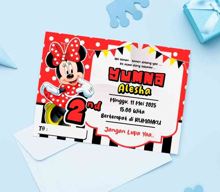 Undangan ulang tahun ini didesain dengan tema karakter Minnie Mouse yang ceria dan penuh warna. Dominasi warna merah, putih, dan hitam memberikan kesa...
