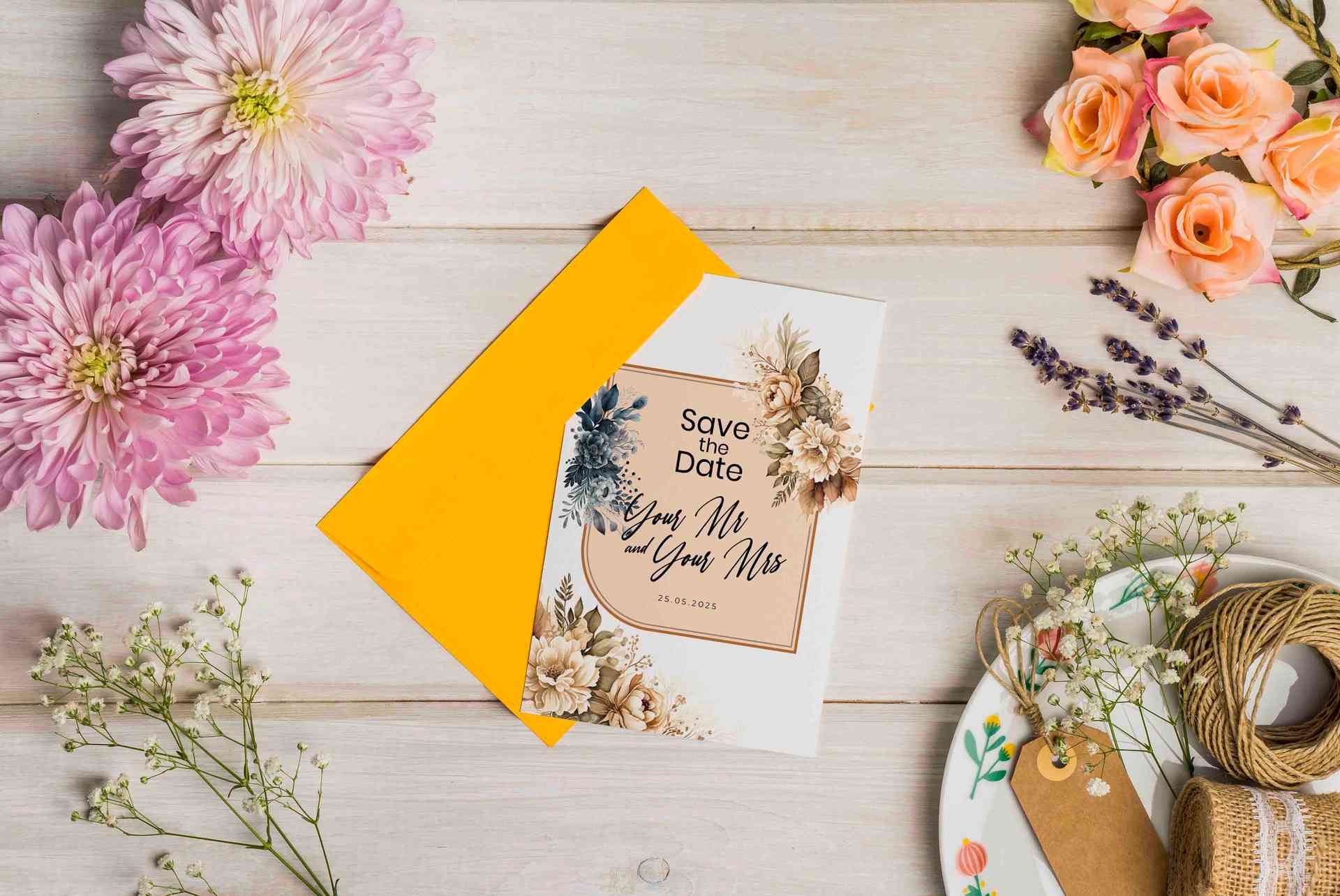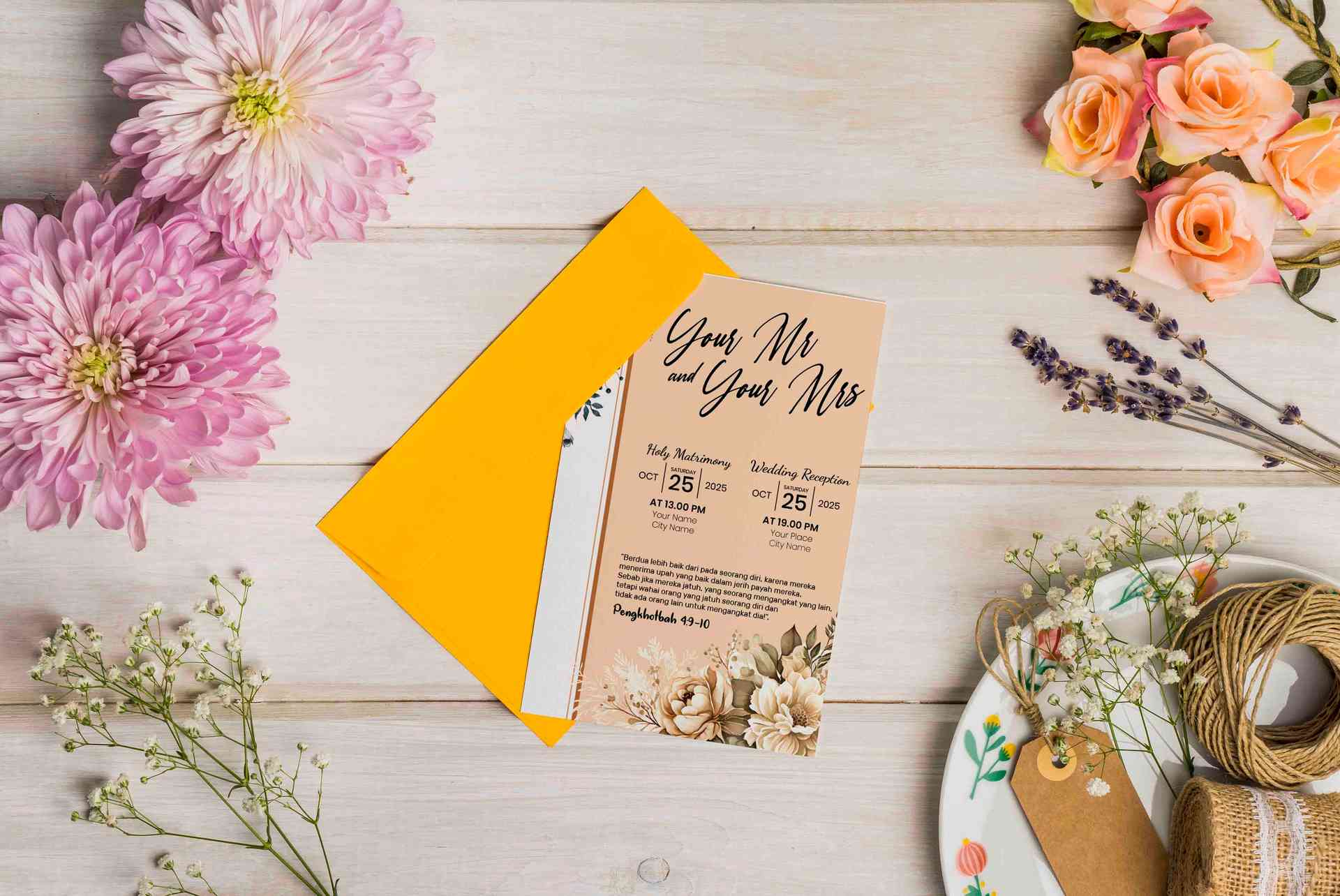 Undangan pernikahan ini menampilkan desain floral vintage dengan dominasi warna coklat lembut dan krem yang memancarkan kesan hangat, klasik, dan eleg...