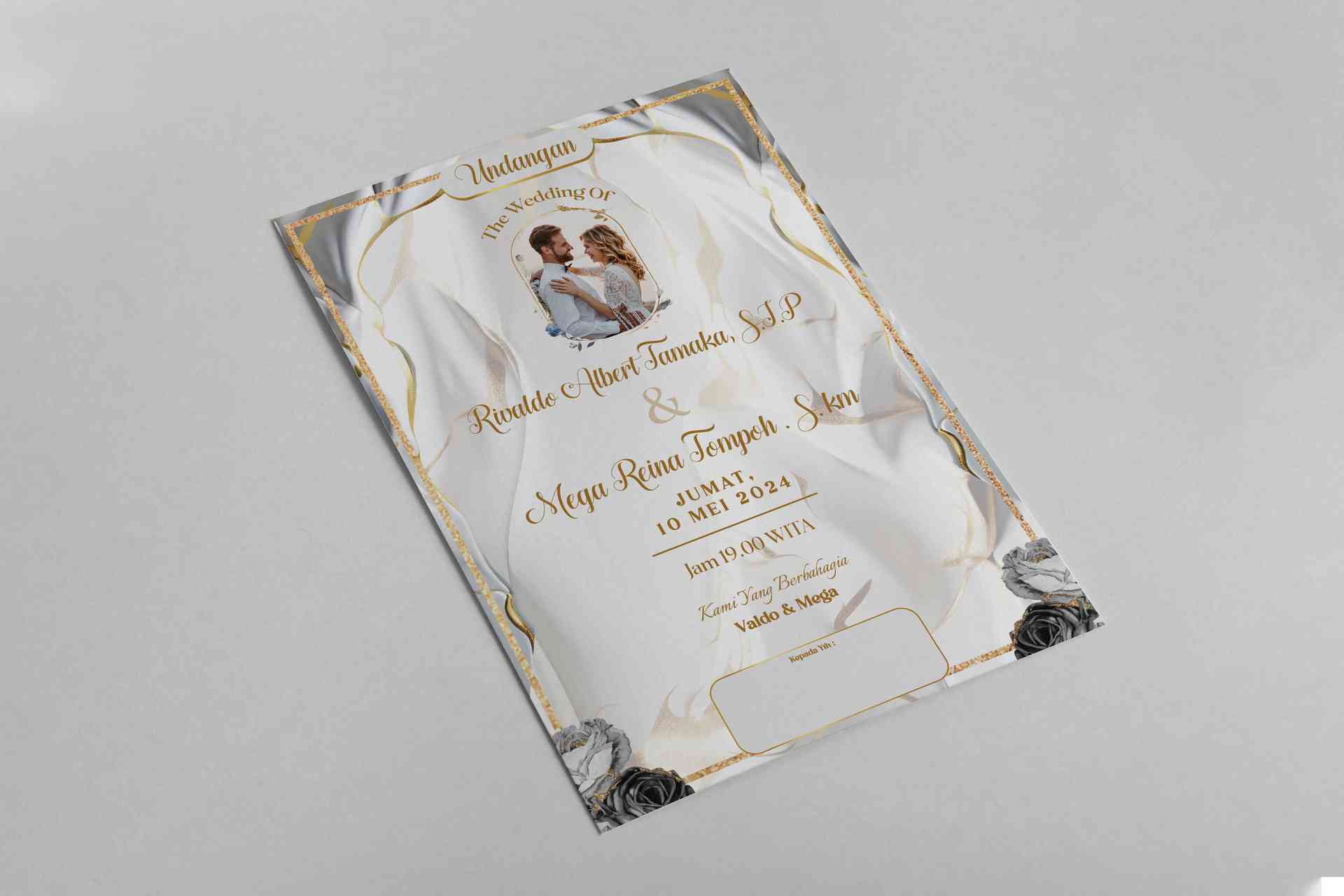 Gambar ini adalah mockup desain undangan pernikahan yang elegan dan mewah. Di bagian atas, terdapat tulisan "Undangan" dengan font berwarna emas yang...