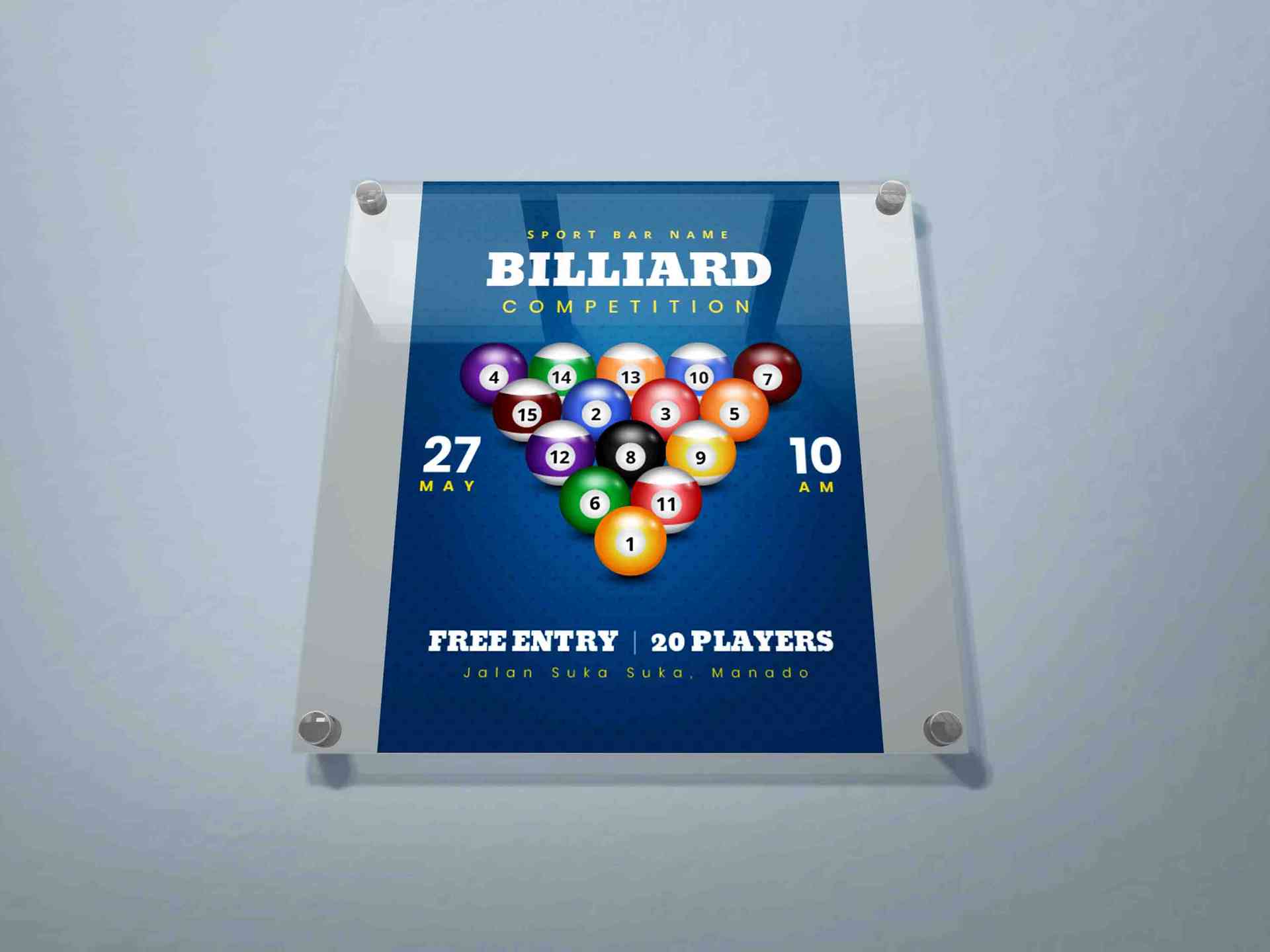 Wall poster bertema kompetisi biliar ini berbentuk persegi panjang dengan warna biru sebagai latar utama, menampilkan susunan bola biliar bernomor yan...