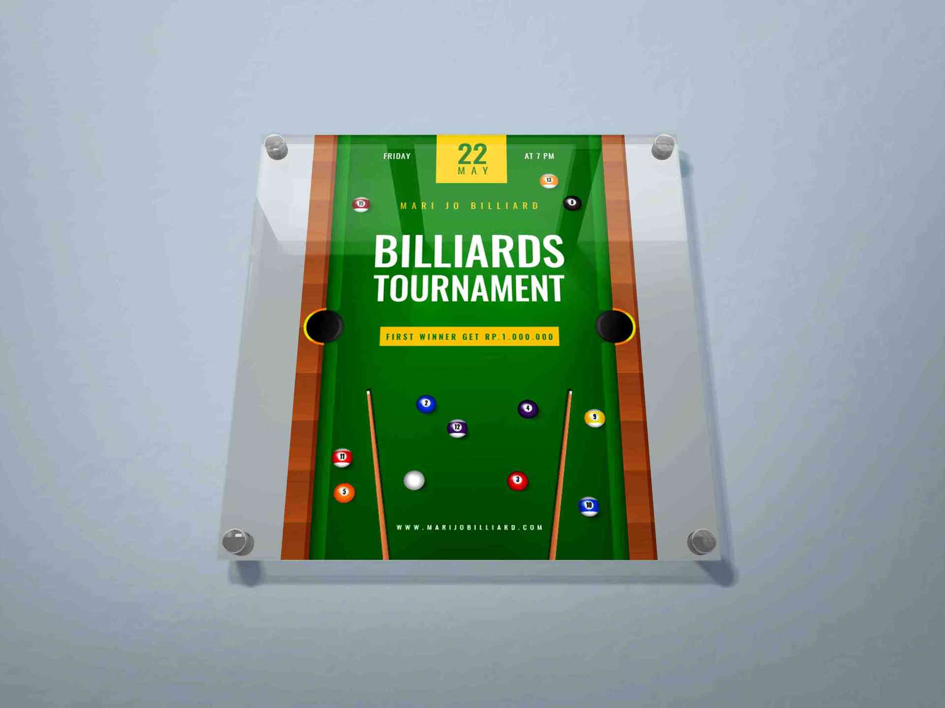 Poster dinding tematik turnamen billiard ini berbentuk persegi panjang vertikal dengan dominasi warna hijau, menyerupai permukaan meja billiard. Eleme...