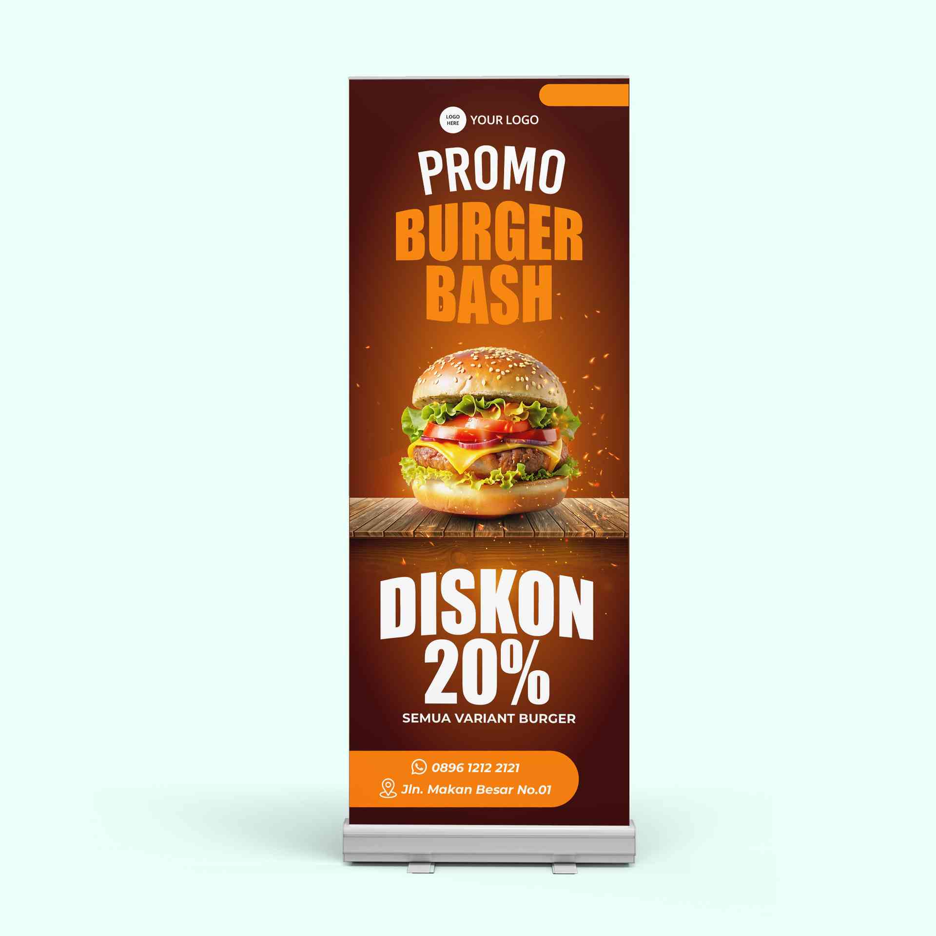 Banner ini menampilkan promosi menarik untuk burger dengan diskon 20% untuk semua varian burger. Gambar menunjukkan burger yang menggugah selera denga...