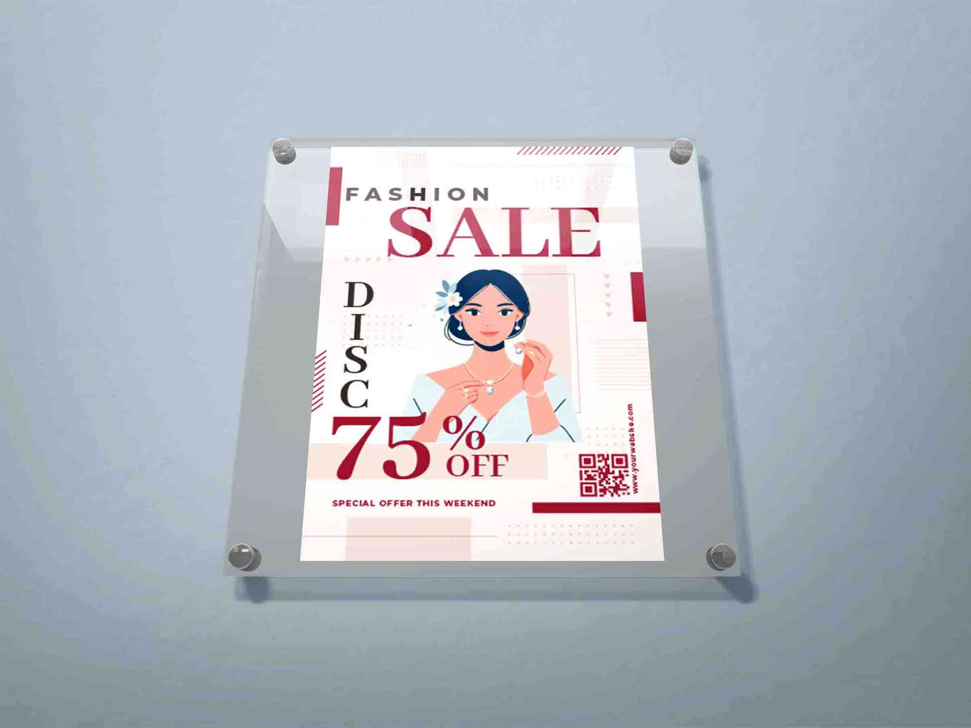 Desain ini merupakan mockup papan informasi atau poster promosi yang dipasang pada dinding menggunakan panel akrilik transparan dengan empat baut stai...