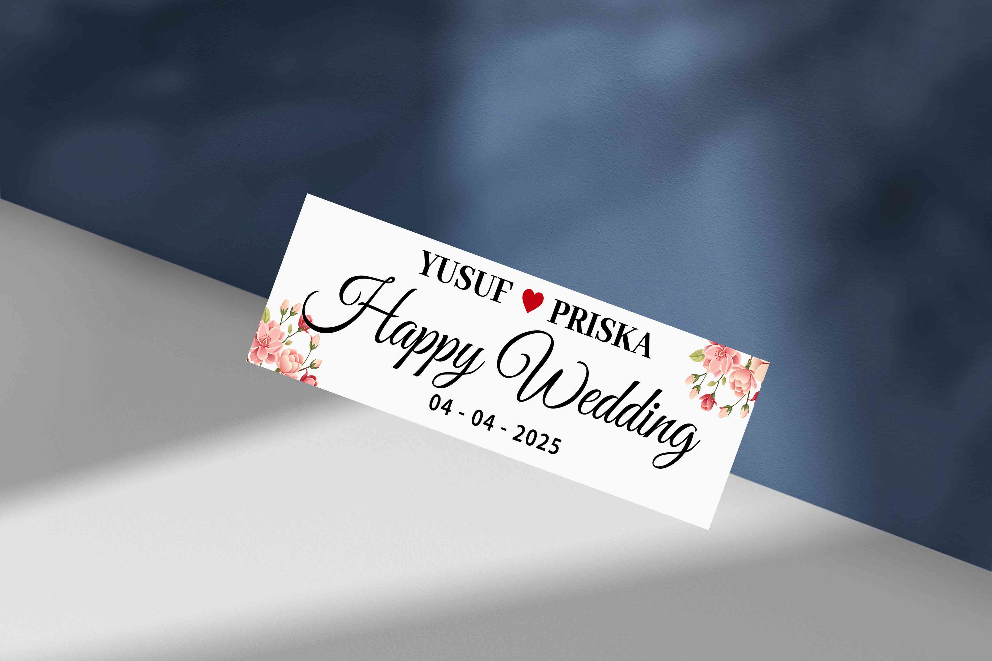 Desain wedding plat mobil pengantin dengan nuansa elegan dan romantis. Di tengah plat tertulis "Happy Wedding" dengan gaya tulisan kaligrafi yang angg...