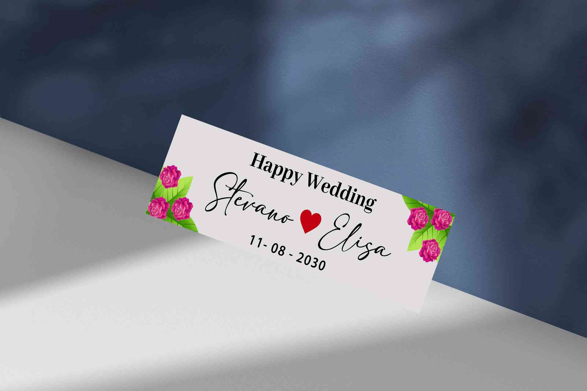 Nama pasangan ditulis besar di bagian tengah dengan font serif tegas berwarna hitam, dipisahkan oleh ikon hati merah yang melambangkan cinta yang bersatu. Di atasnya terdapat kalimat “Happy Wedding” dengan tipografi kaligrafi yang anggun, serta tanggal pernikahan 11 - 08 - 2030 ditampilkan rapi di bawah sebagai pengingat hari bahagia. Desain ini cocok untuk berbagai keperluan dekorasi pernikahan, terutama untuk acara dengan tema rustic chic, garden wedding, hingga konsep minimalis modern.
