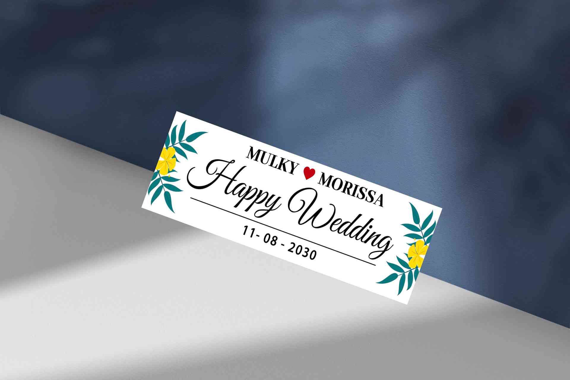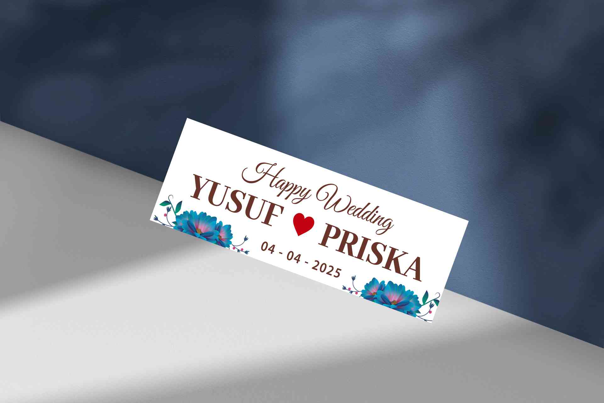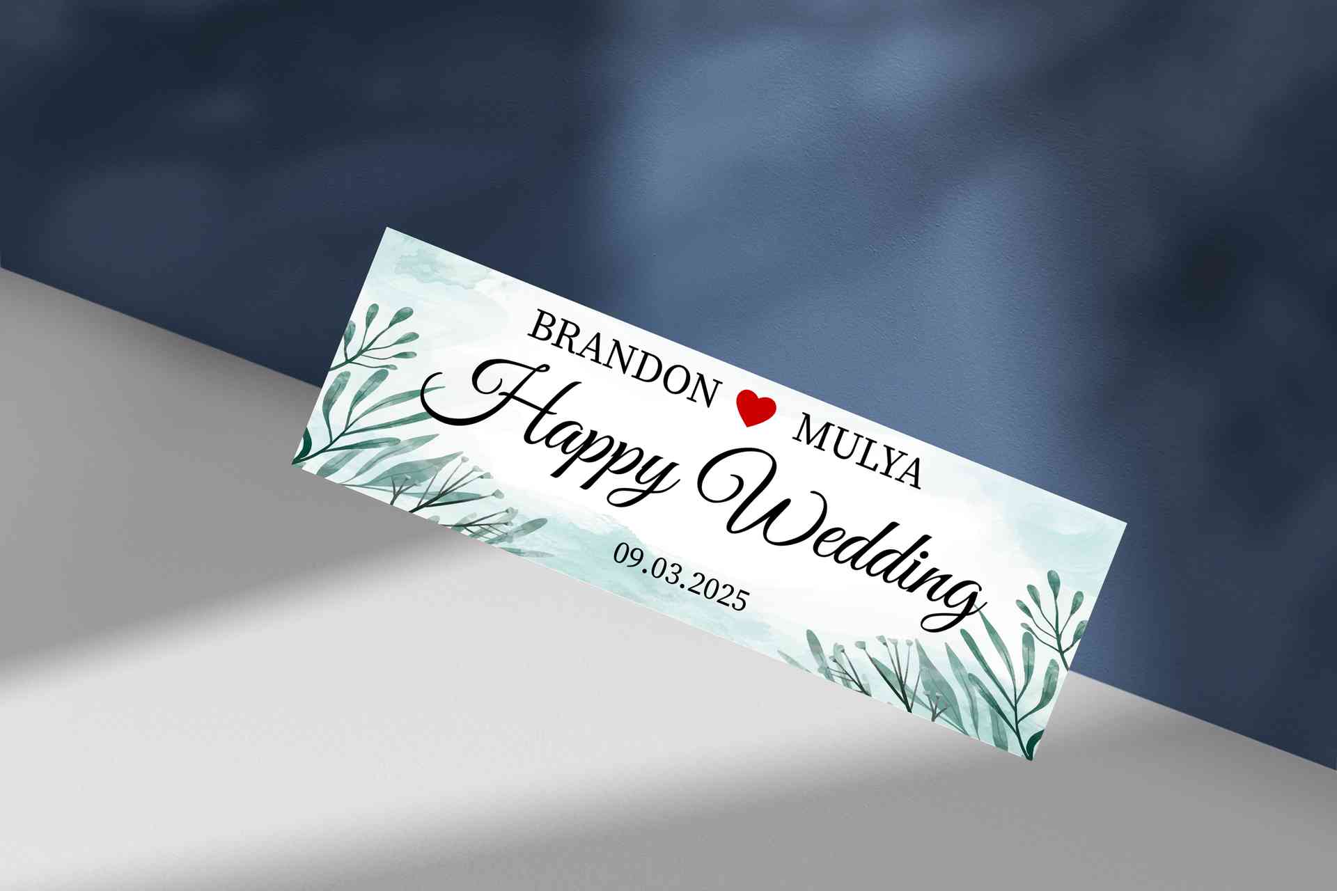 Mengusung warna biru kehijauan yang tenang, desain ini dilengkapi ilustrasi dedaunan hijau yang menambah kesan natural dan segar. Teks putih pada latar biru membuat pesan ‘Happy Wedding’ dan nama pasangan terlihat bersih dan elegan.