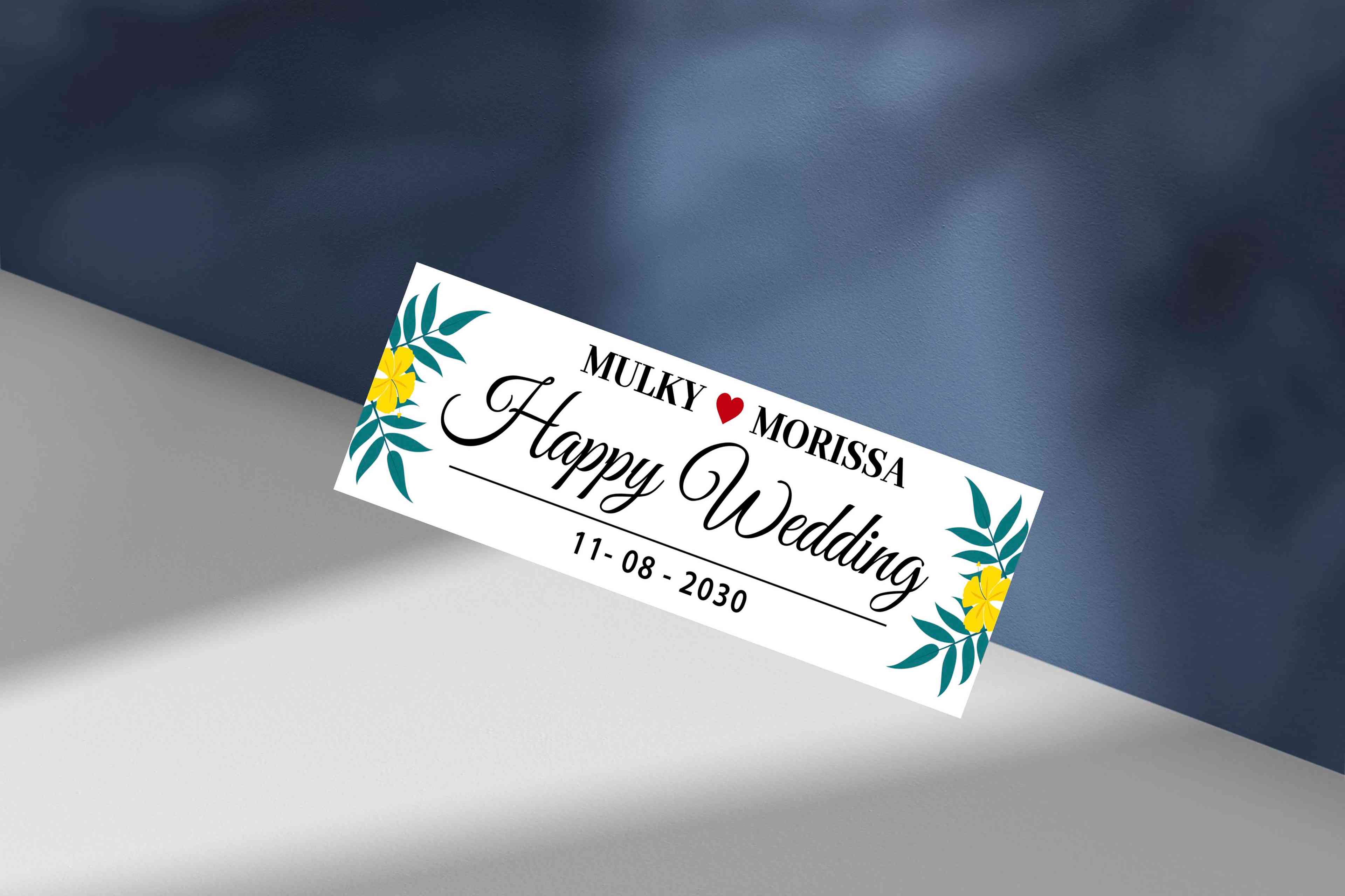 Desain plat mobil wedding minimalis dengan nuansa putih bersih yang memberikan kesan elegan dan modern. Tulisan happy wedding tampil dominan dalam font kaligrafi yang indah, disertai nama pasangan di bagian atas, serta tanggal pernikahan di bawahnya. Elemen bunga berwarna pink lembut di sisi kiri dan kanan menambah sentuhan romantis dan manis. Cocok untuk mempercantik mobil pengantin dengan gaya simpel tapi tetap classy.