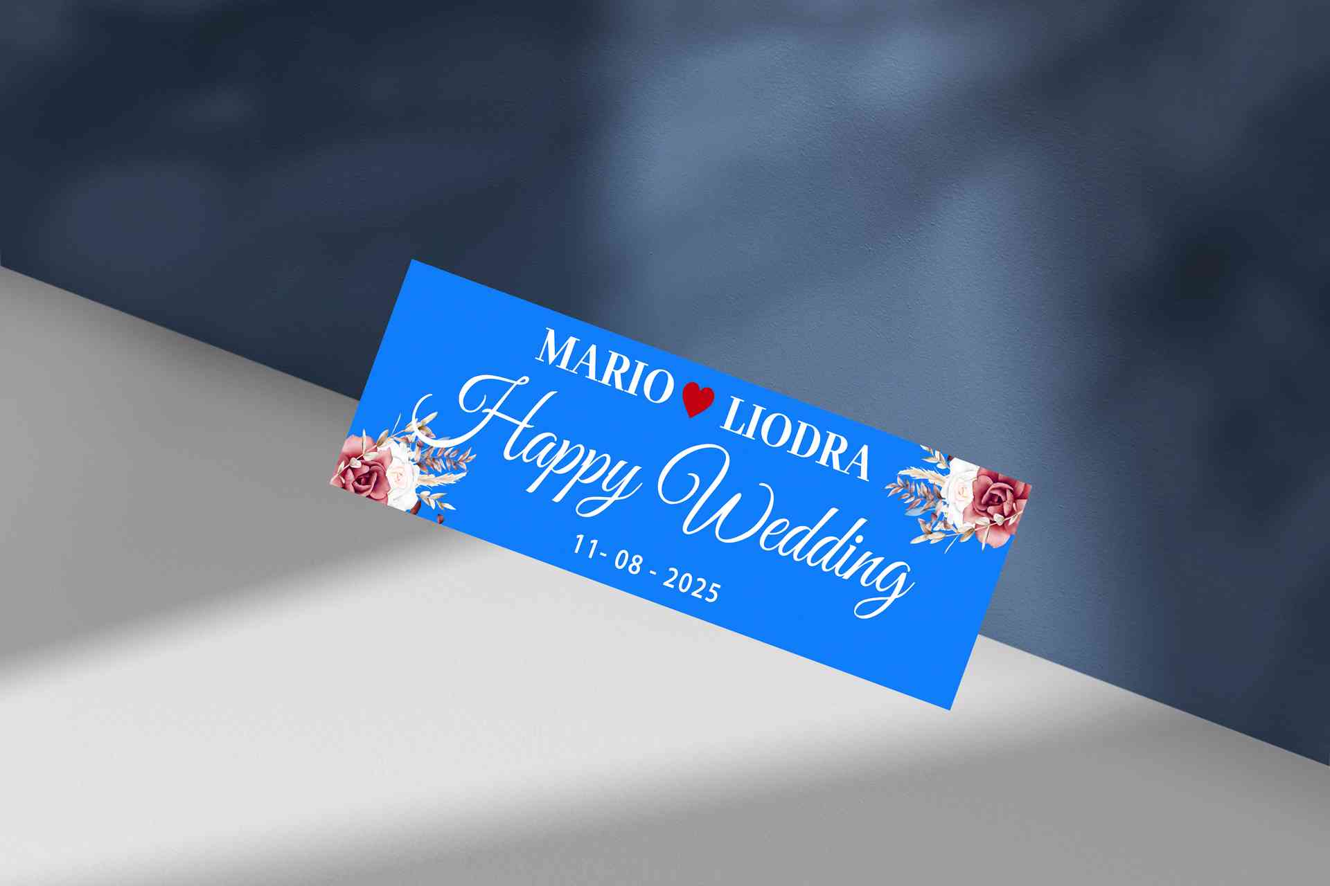 Desain kartu ucapan pernikahan elegan dengan latar belakang biru cerah. Teks utama berbunyi dalam font kaligrafi putih yang anggun, dilengkapi nama pa...