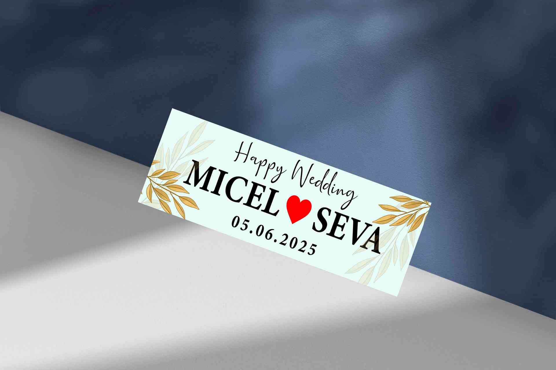 Dengan latar putih bersih dan ornamen daun emas di sisi kanan dan kiri, desain ini menonjolkan nuansa mewah namun tetap minimalis. Warna hitam dan mer...