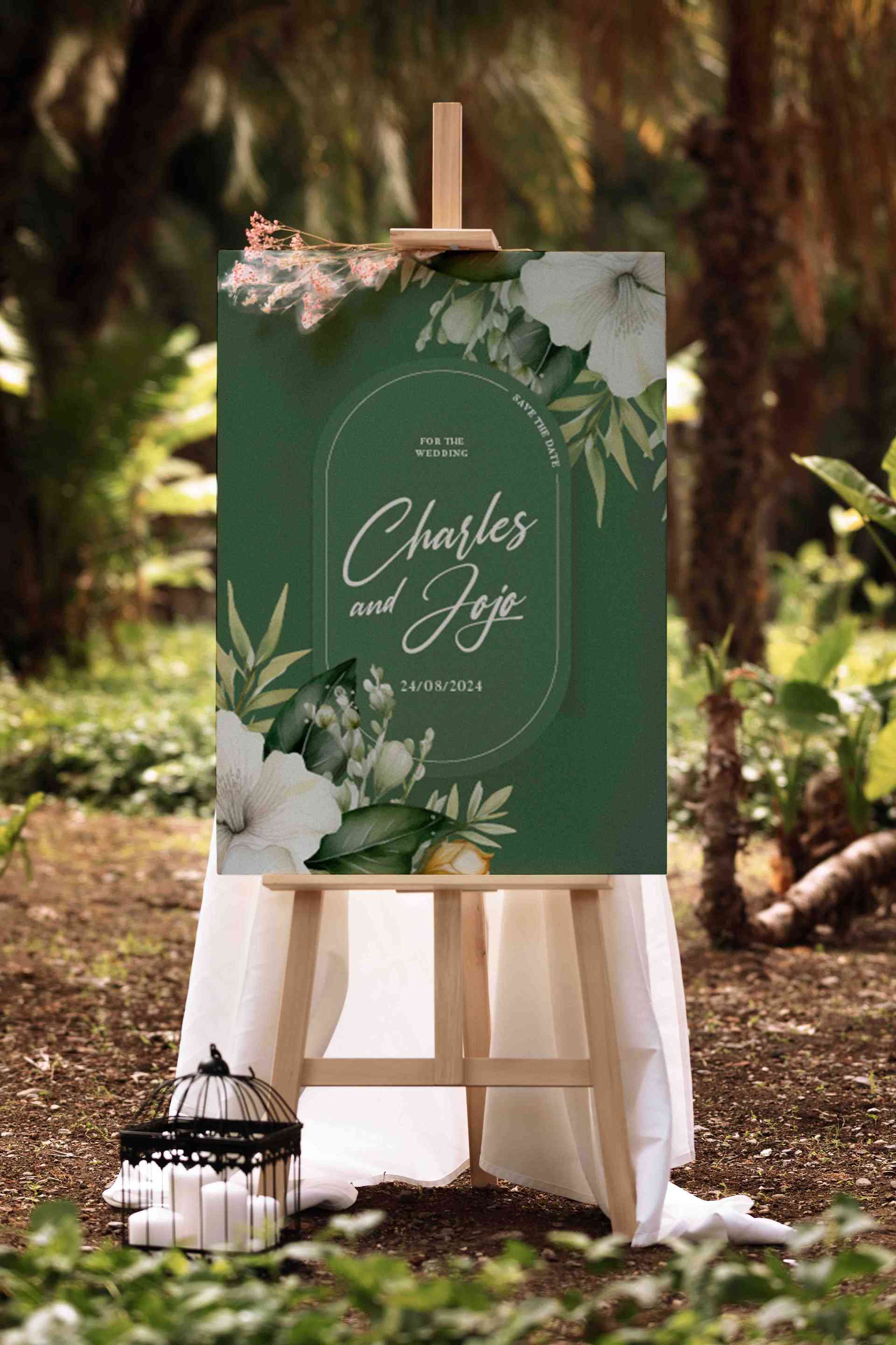 Wedding sign ini hadir dengan nuansa hijau gelap yang elegan, dipadukan dengan ilustrasi bunga putih dan dedaunan segar di bagian sudutnya. Nama pasan...