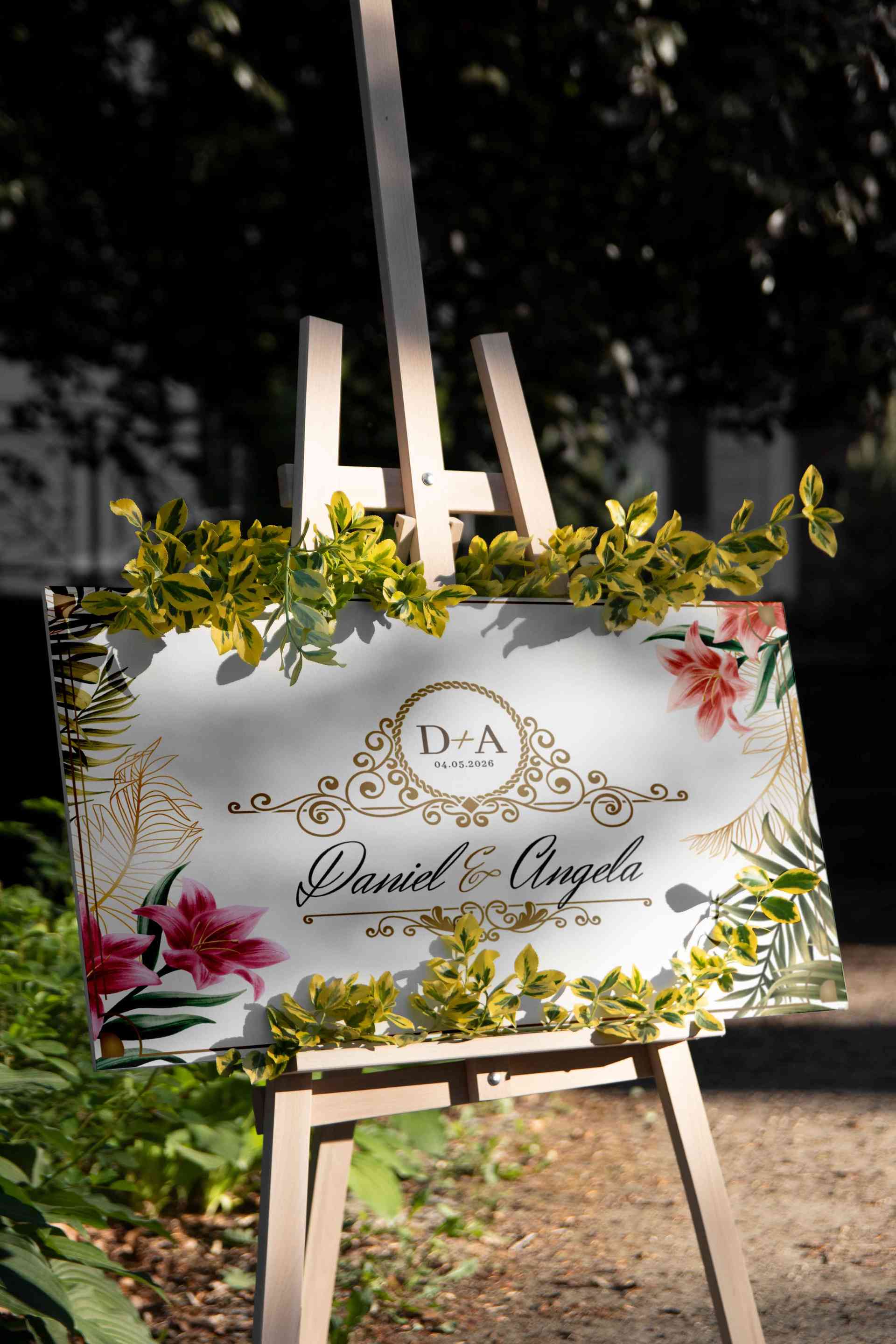Desain welcome sign ini tampil dengan gaya klasik elegan bernuansa tropikal. Menggunakan dominasi warna putih sebagai latar, papan ini dihiasi dengan...