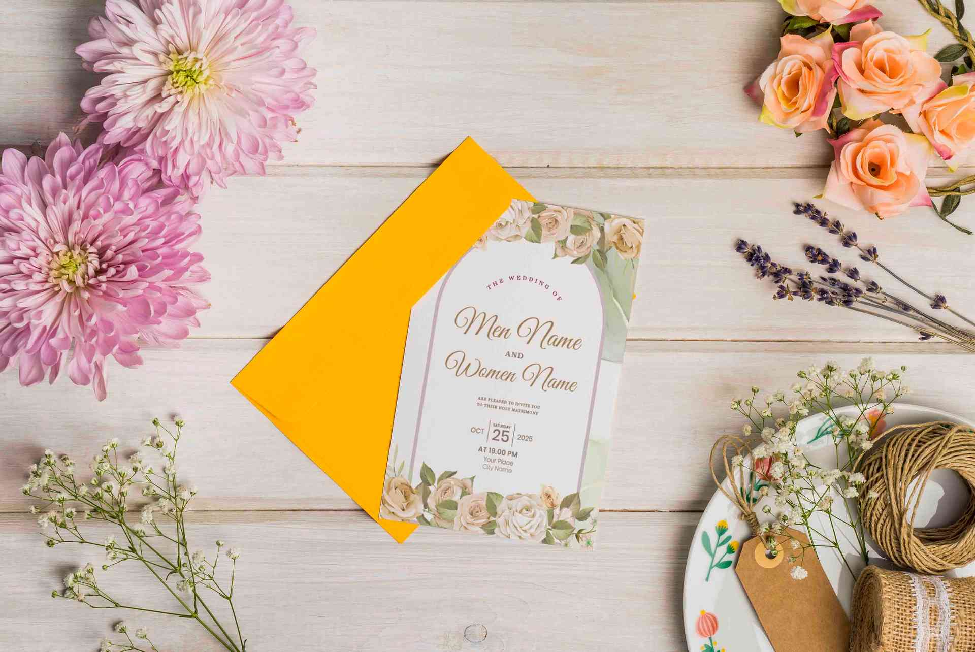 Undangan pernikahan bertema elegan dengan nuansa floral modern ini berbentuk persegi panjang dan didominasi oleh desain bunga mawar berwarna merah mud...