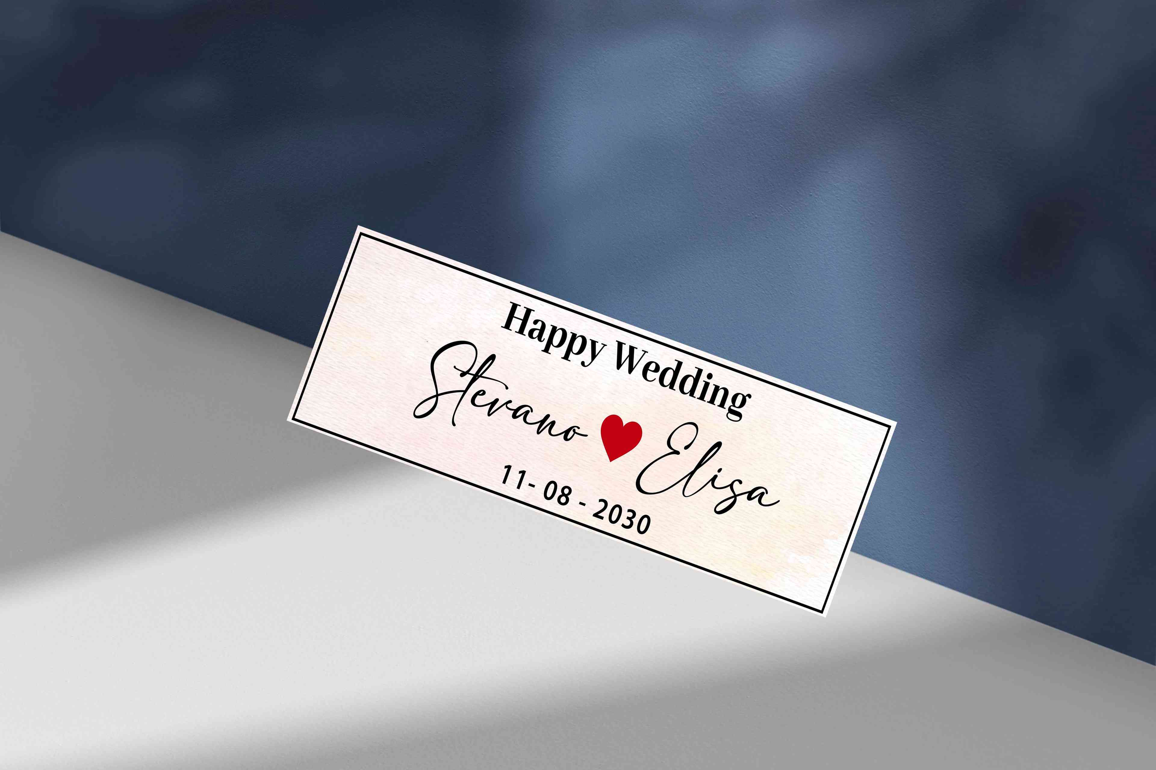 Wedding plat dengan desain elegan dan romantis, menampilkan nama pasangan dalam font klasik yang anggun. Tulisan Happy wedding ditampilkan dalam gaya...