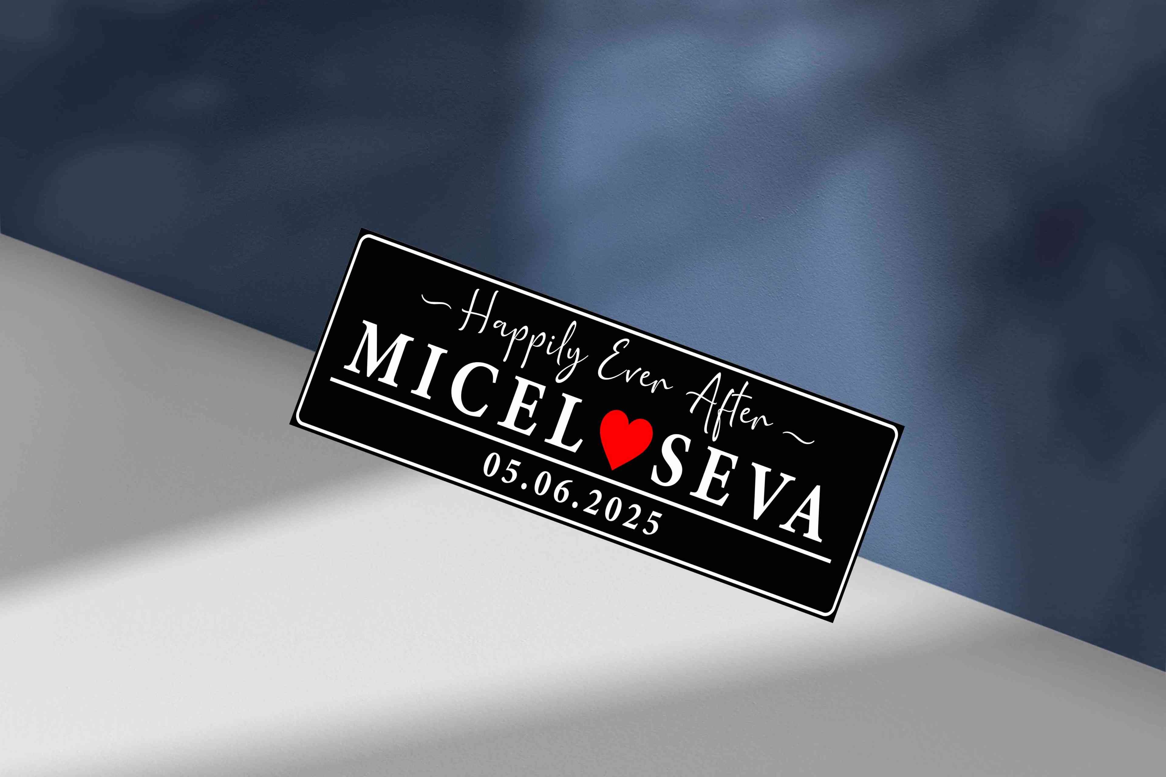 Desain plat ini menonjol dengan nuansa hitam elegan dan tipografi putih kontras, dipermanis dengan ikon hati merah di tengah. Tulisan “Happily Ever Af...