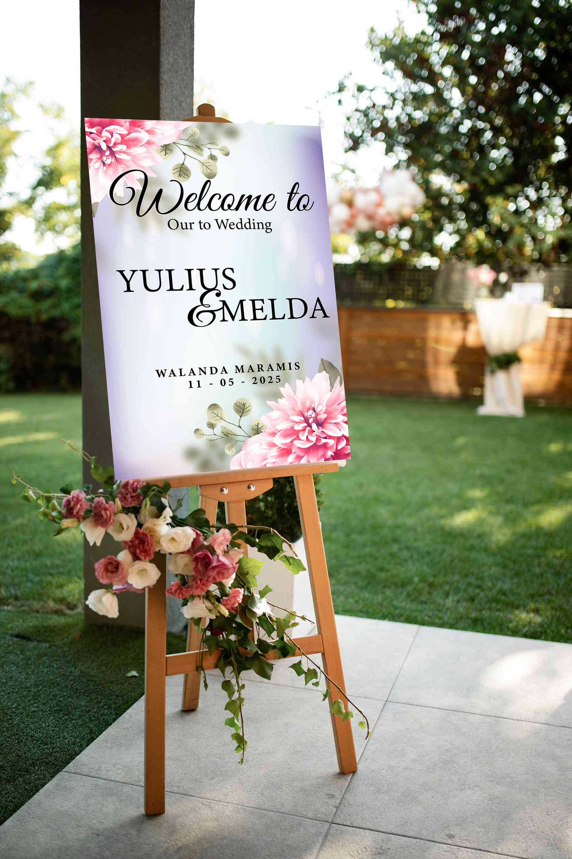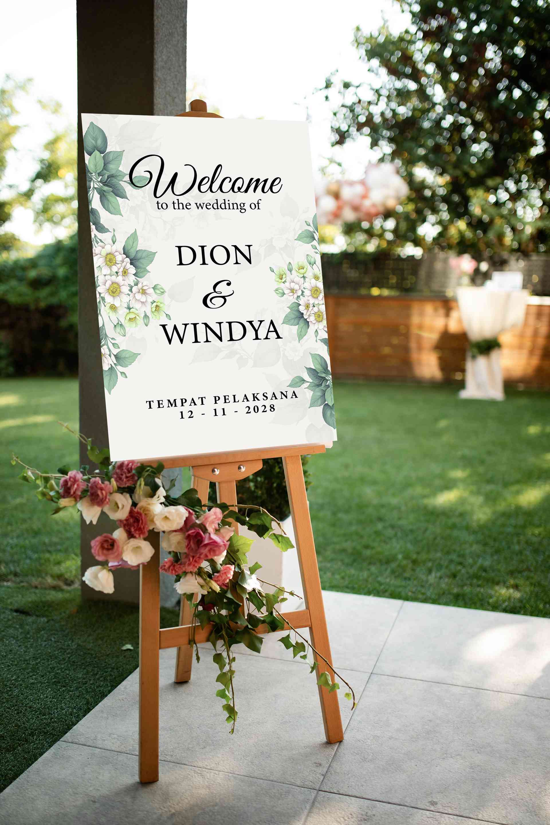 Welcome sign ini tampil dengan nuansa warna netral dan sentuhan floral yang anggun, menonjolkan kesan elegan dan romantis. Menggunakan kombinasi font klasik dan modern, desain ini memberikan sambutan hangat kepada para tamu yang hadir. Dihiasi dengan rangkaian bunga segar pada bagian kaki easel serta aksen dedaunan menjuntai, keseluruhan tampilan sign ini memperkuat suasana intimate garden wedding. Tertulis dengan jelas nama mempelai, tanggal pernikahan, serta placeholder untuk lokasi pelaksanaan, menjadikan sign ini tidak hanya informatif tapi juga menambah estetika dekorasi pernikahan.