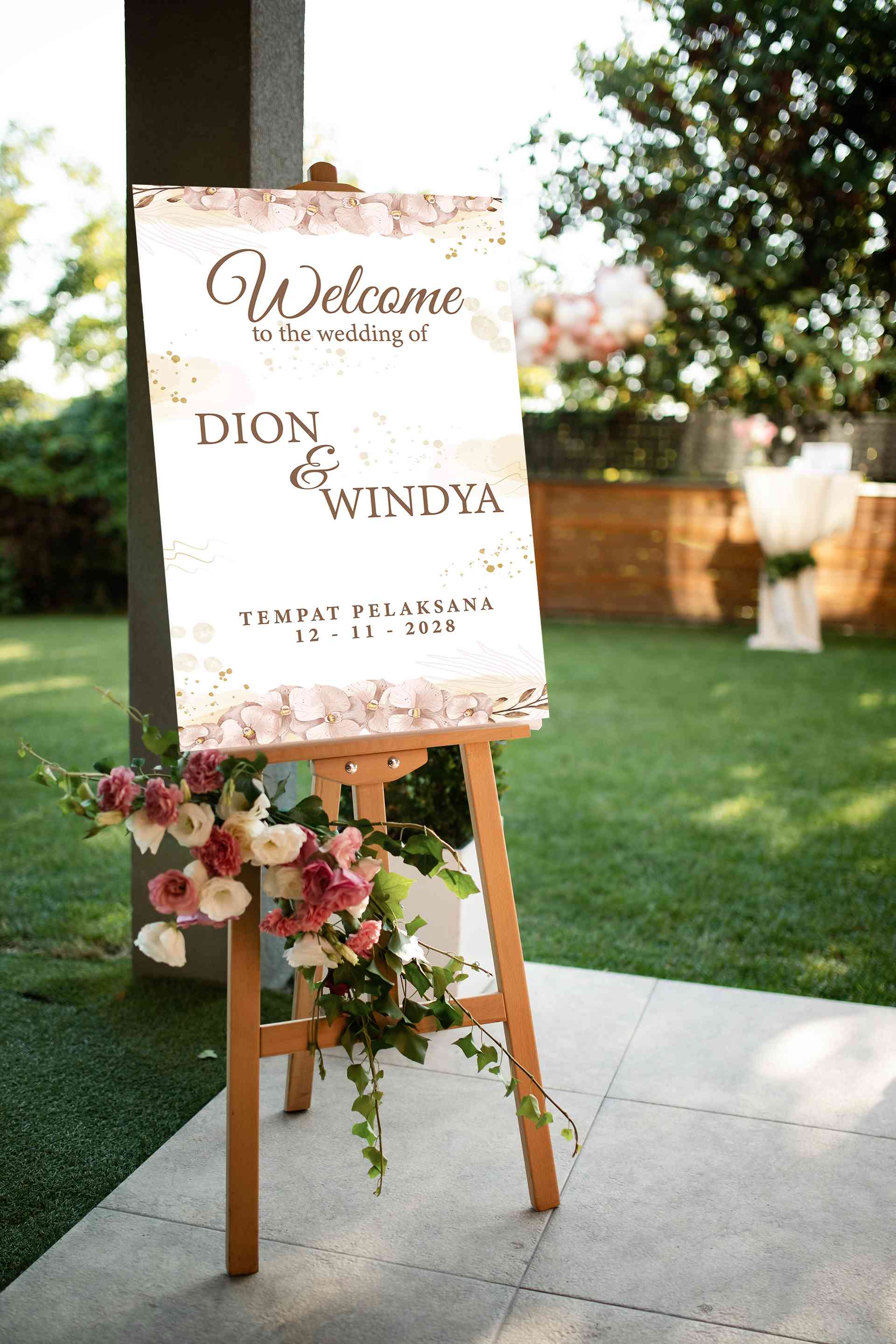 Welcome sign ini tampil dengan nuansa warna netral dan sentuhan floral yang anggun, menonjolkan kesan elegan dan romantis. Menggunakan kombinasi font...