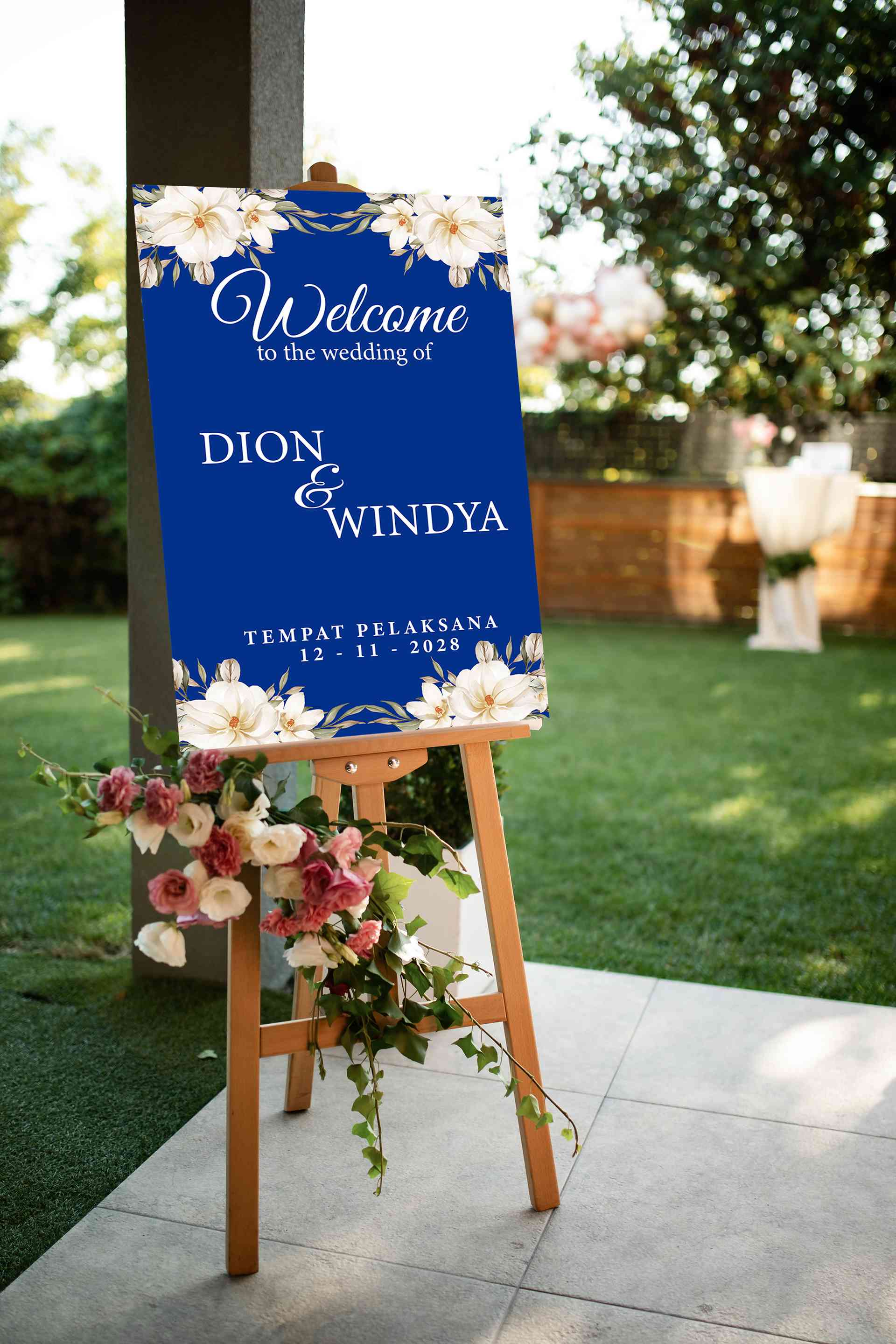 Tampilkan nuansa mewah dan classy di hari bahagia dengan welcome sign berwarna biru navy yang elegan ini. Didominasi warna biru royal yang kuat, sign...