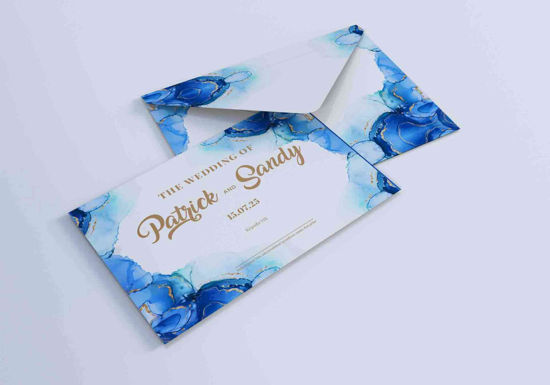 Amplop wedding bernuansa biru dan gold ini berbentuk persegi panjang dengan desain elegan, menonjolkan motif abstrak berwarna biru yang berpadu aksen...