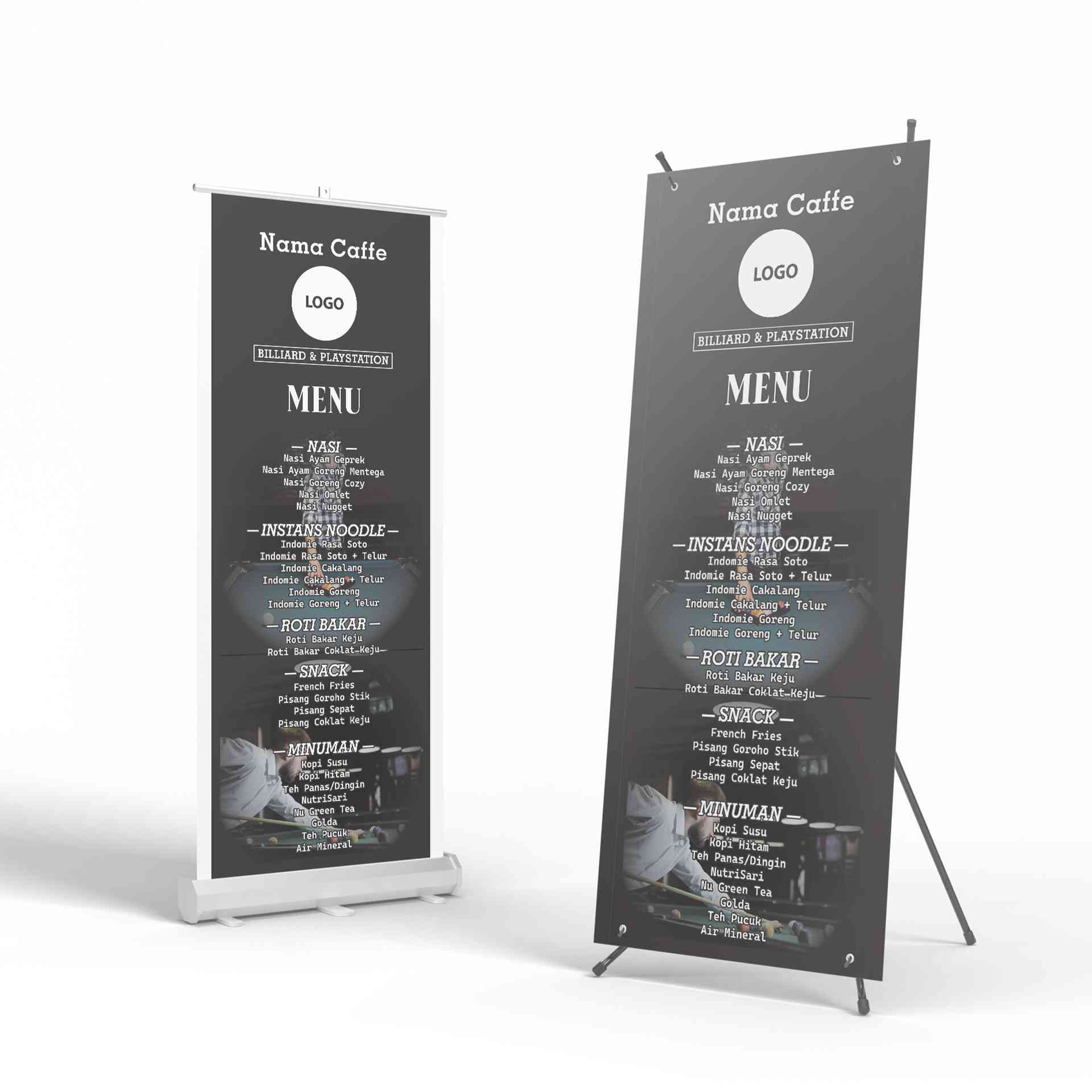 Gambar yang menunjukkan dua jenis media promosi berbentuk standing banner yang menampilkan menu dari sebuah kafe bernama "Nama Caffe". Berikut adalah...