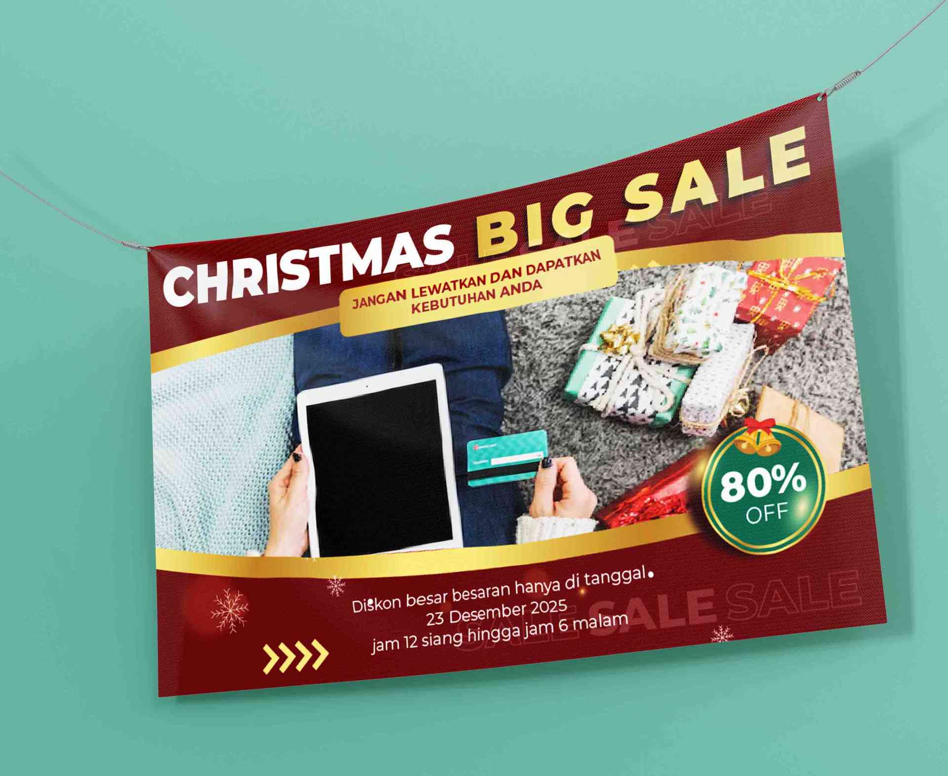 X Banner promosi bertema Christmas ini didominasi oleh warna merah dan gold, menonjolkan nuansa meriah khas Natal. Teks utama “Christmas Big Sale” den...
