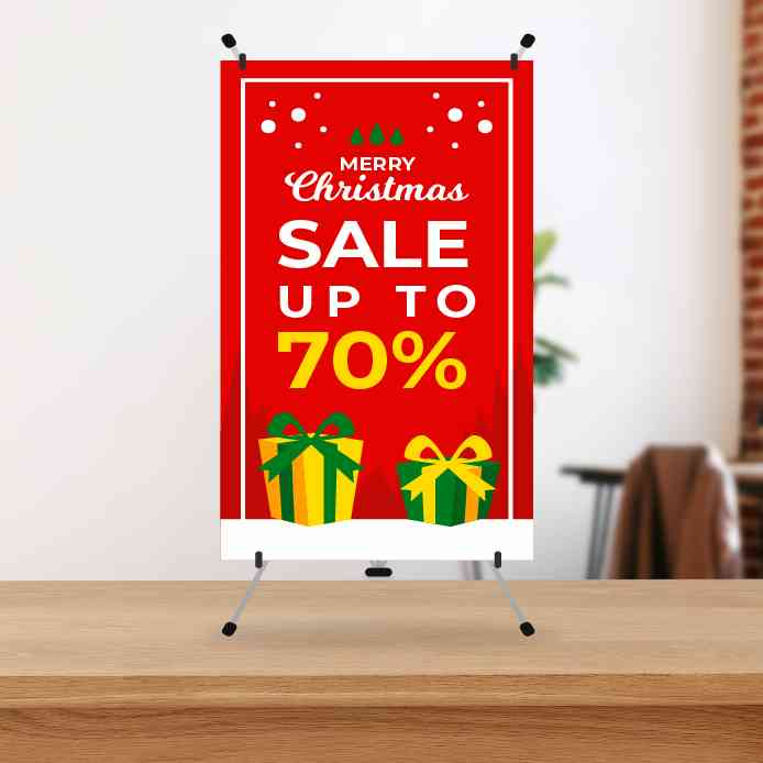 Mini standing banner dengan tema Merry Christmas Sale ini berwarna dominan merah dengan tipografi putih dan kuning yang mencolok, menawarkan diskon hi...