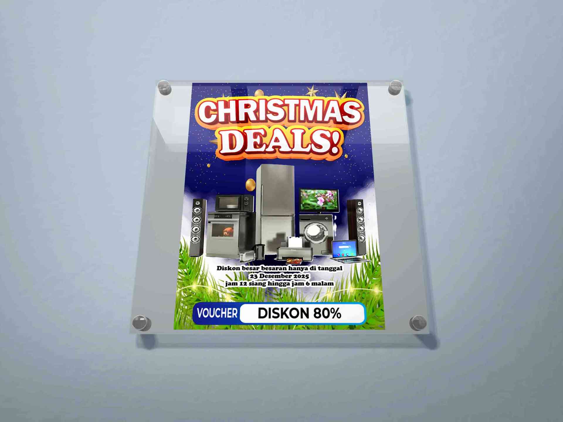Baliho promosi bertema Christmas Deals untuk produk elektronik ini berbentuk persegi panjang dengan dominasi warna merah dan aksen emas serta hijau, m...