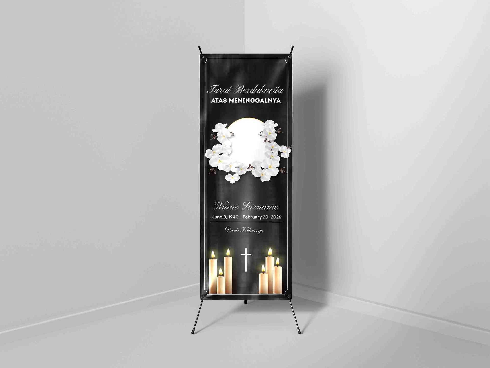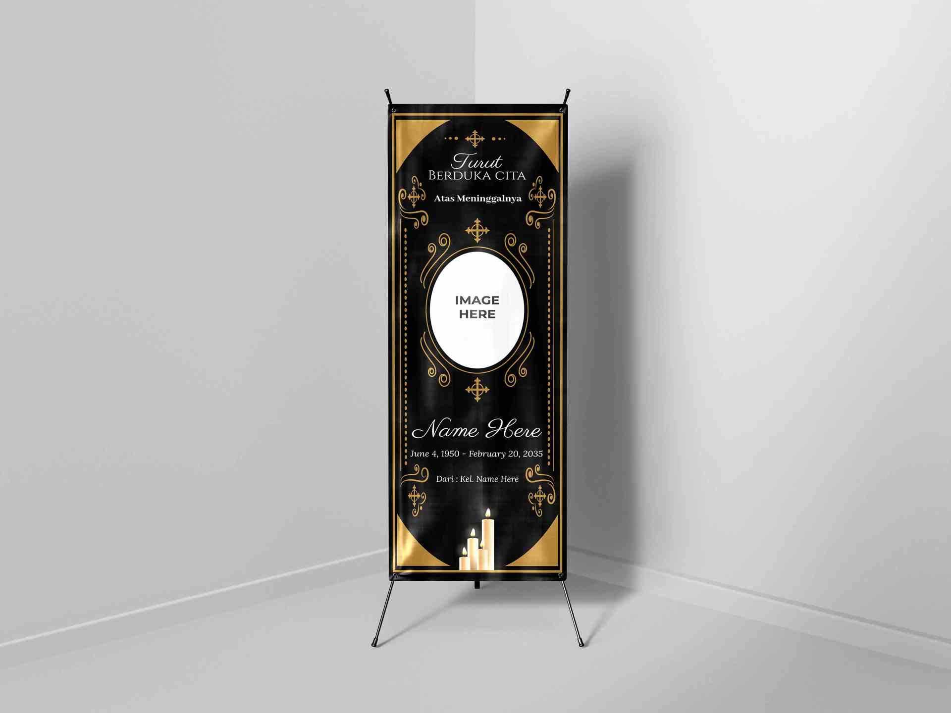 Desain ini merupakan xbanner ucapan duka cita yang didominasi oleh warna hitam dan putih untuk menunjukkan suasana berkabung dan penghormatan terakhir. Teks "Turut Berduka Cita Atas Meninggalnya" ditampilkan dengan font klasik elegan di bagian atas. Di bagian tengah terdapat area siluet untuk tempat foto almarhum/almarhumah dengan latar belakang awan dan burung merpati putih yang melambangkan kedamaian dan kepergian jiwa ke tempat yang lebih baik. Tulisan “In Loving Memories” dan “Name Here” memberi ruang bagi penyesuaian nama. Di bawahnya, dituliskan identitas keluarga serta siapa yang mengirimkan ucapan belasungkawa. Ornamen floral di sudut atas dan bawah banner menambah kesan sakral dan hormat. Banner ini sangat cocok digunakan di rumah duka atau acara pemakaman sebagai bentuk penghormatan.
