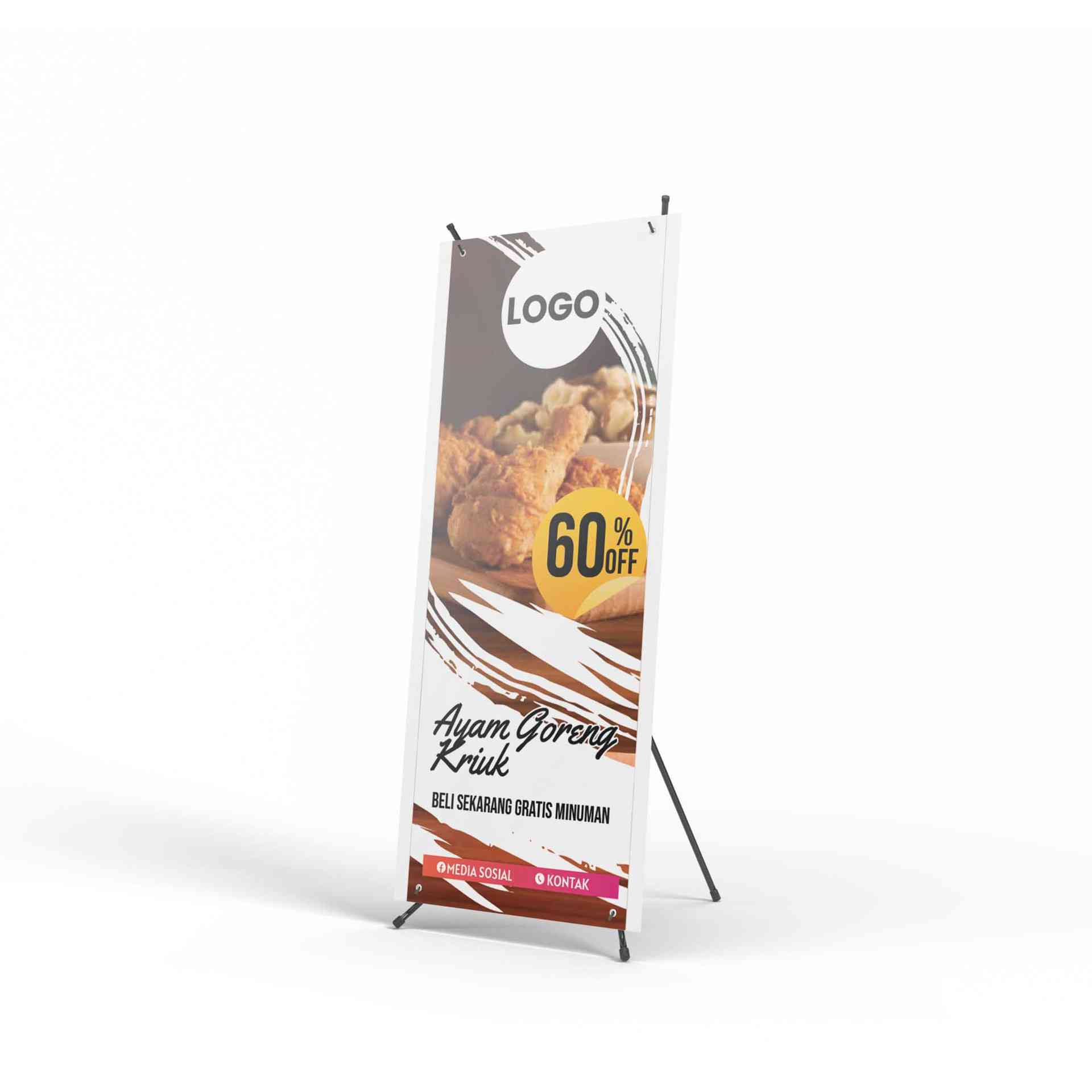 X Banner – Format VertikalX Banner tampil memanjang secara vertikal dengan layout efisien. Di bagian atas terdapat logo dan tulisan besar “KIOS KO JHO...