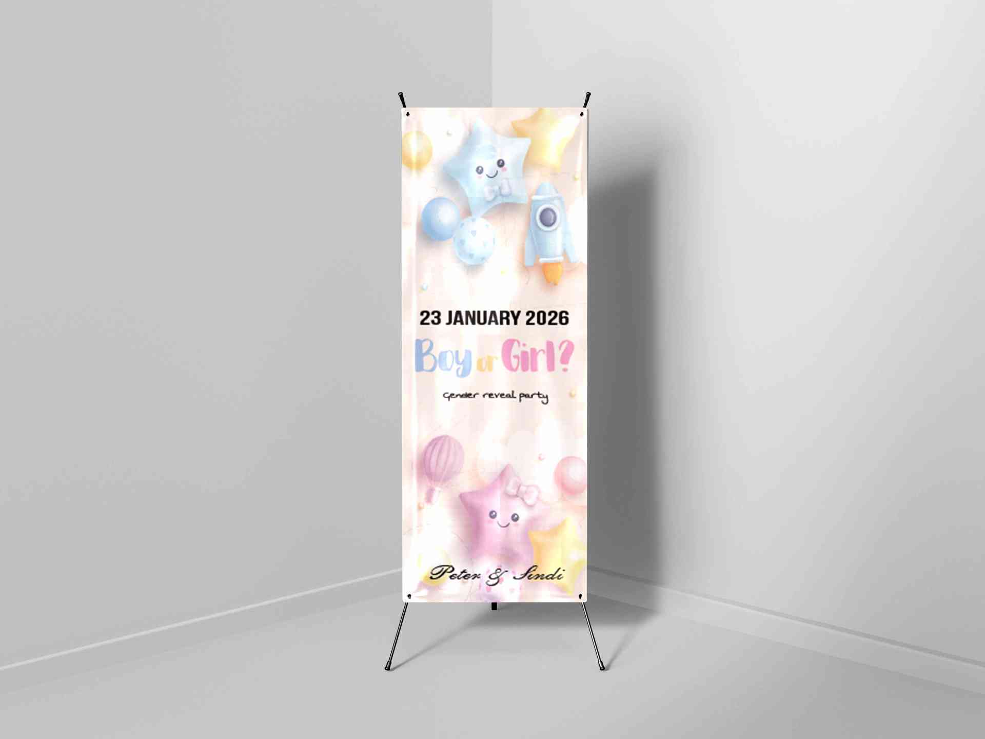 Desain x-banner ini mengusung tema gender reveal dengan judul "Blue or Pink?" yang tampil dalam gaya ceria dan penuh warna. Ilustrasi utama menampilkan pasangan suami istri, dengan sang istri sedang mengandung. Warna biru dan pink digunakan sebagai simbol gender bayi laki-laki atau perempuan. Elemen dekoratif seperti bendera gantung, balok huruf, botol susu, dan awan memberikan sentuhan imut dan menyenangkan, cocok untuk acara keluarga yang penuh kebahagiaan.