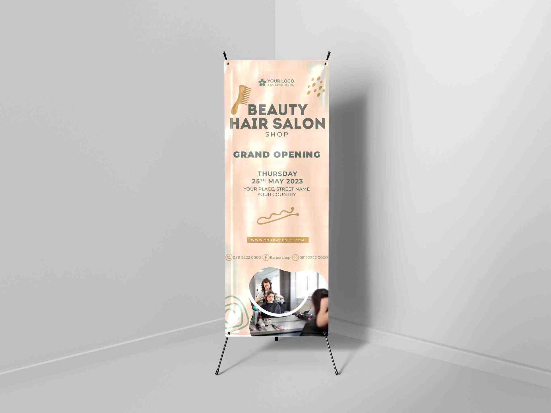 X-banner ini menampilkan desain bergaya minimalis dan elegan dengan nuansa warna peach pastel yang lembut, ideal untuk acara Grand Opening salon kecan...
