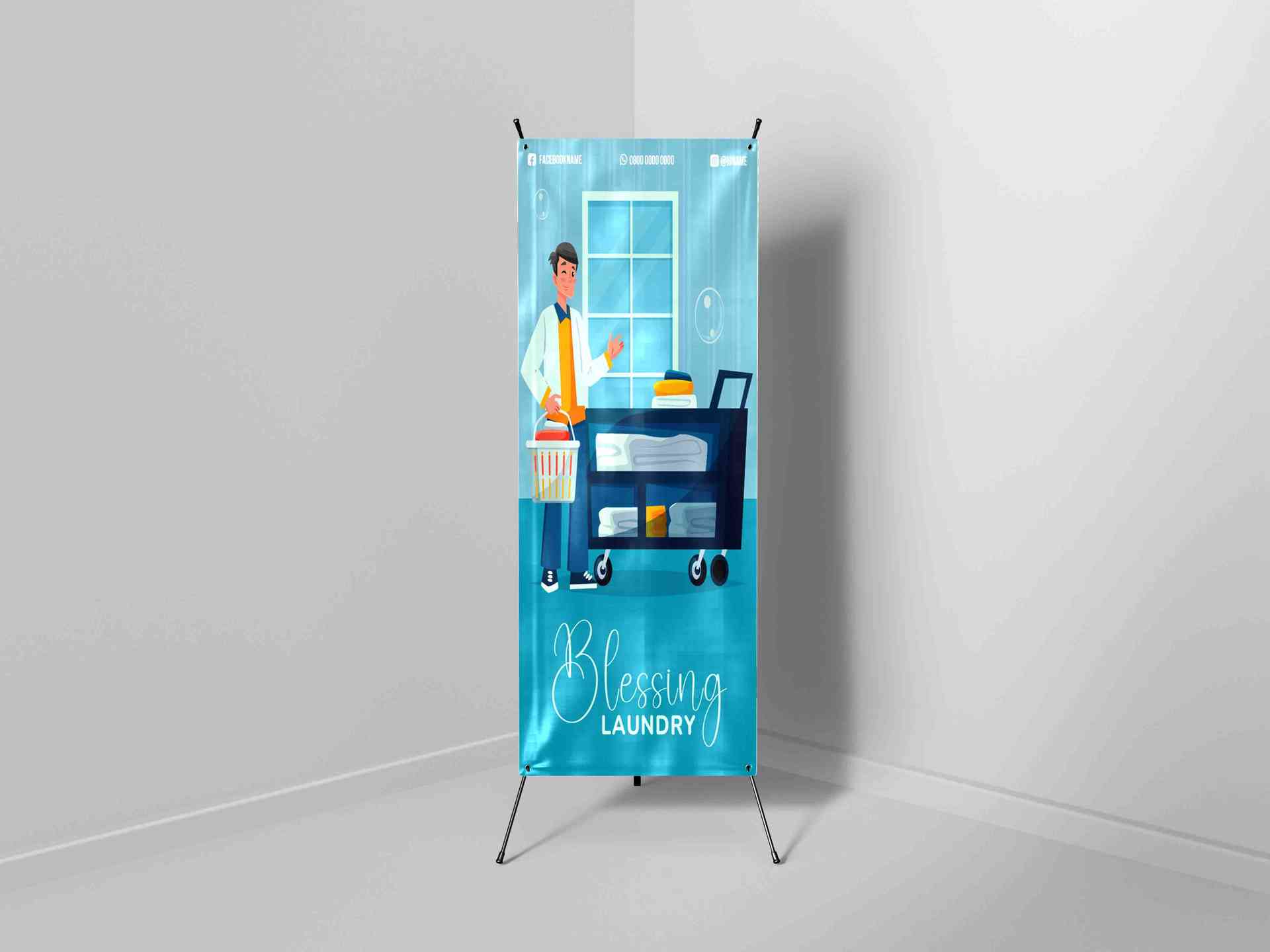 X Banner Blessing Laundry Warna Biru menampilkan bentuk vertikal dengan desain karakter pria berpakaian rapih dan kereta laundry berisi pakaian bersih...