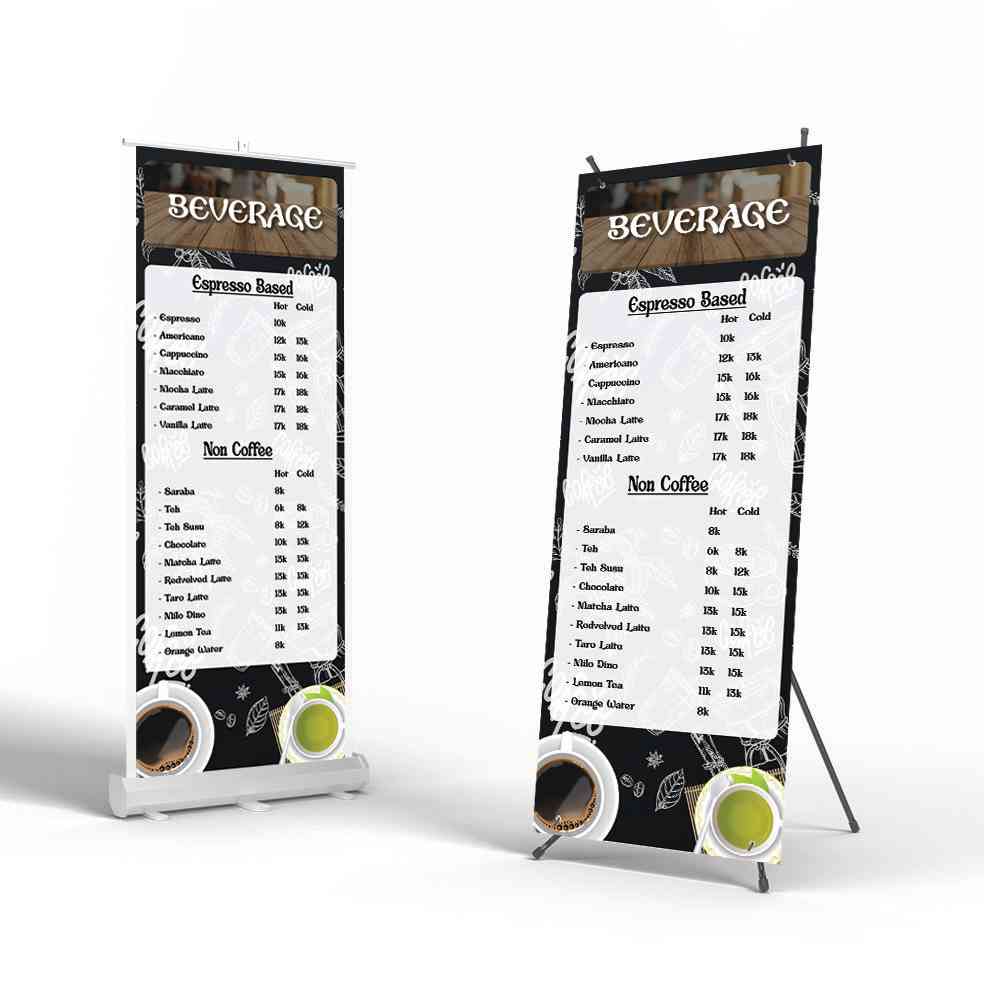 Gambar ini menampilkan dua jenis banner menu minuman dengan desain yang serupa tetapi menggunakan media display yang berbeda. Berikut adalah deskripsi...