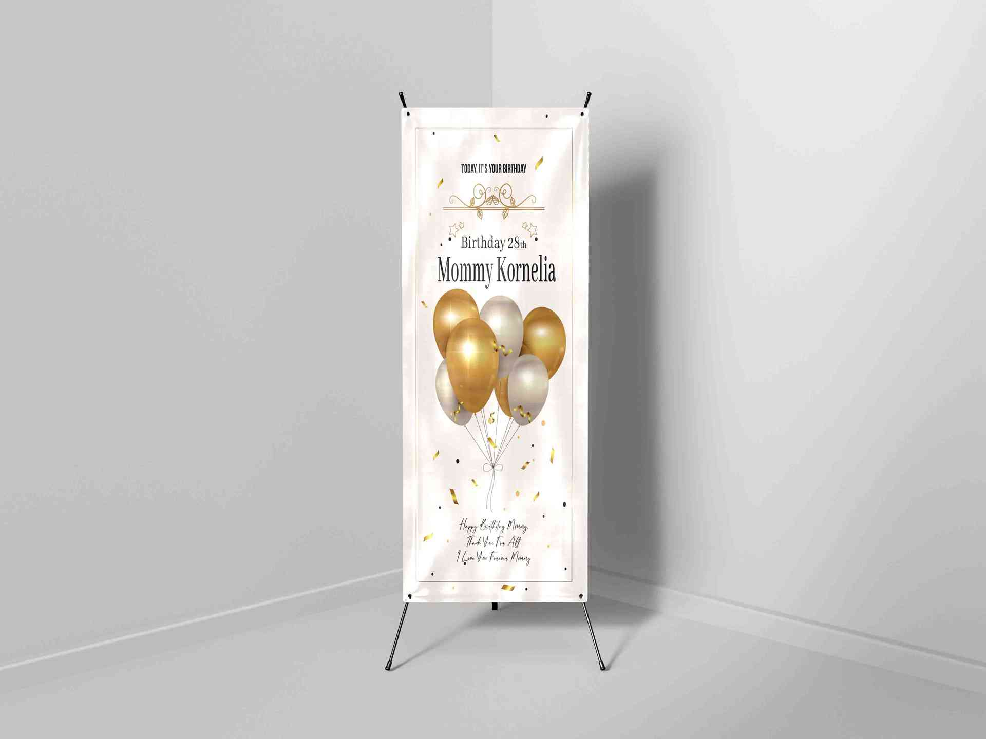 X Banner bertema perayaan ulang tahun ini menampilkan desain vertikal dengan dominasi warna putih, emas, dan perak. Visual utama berupa ilustrasi balo...