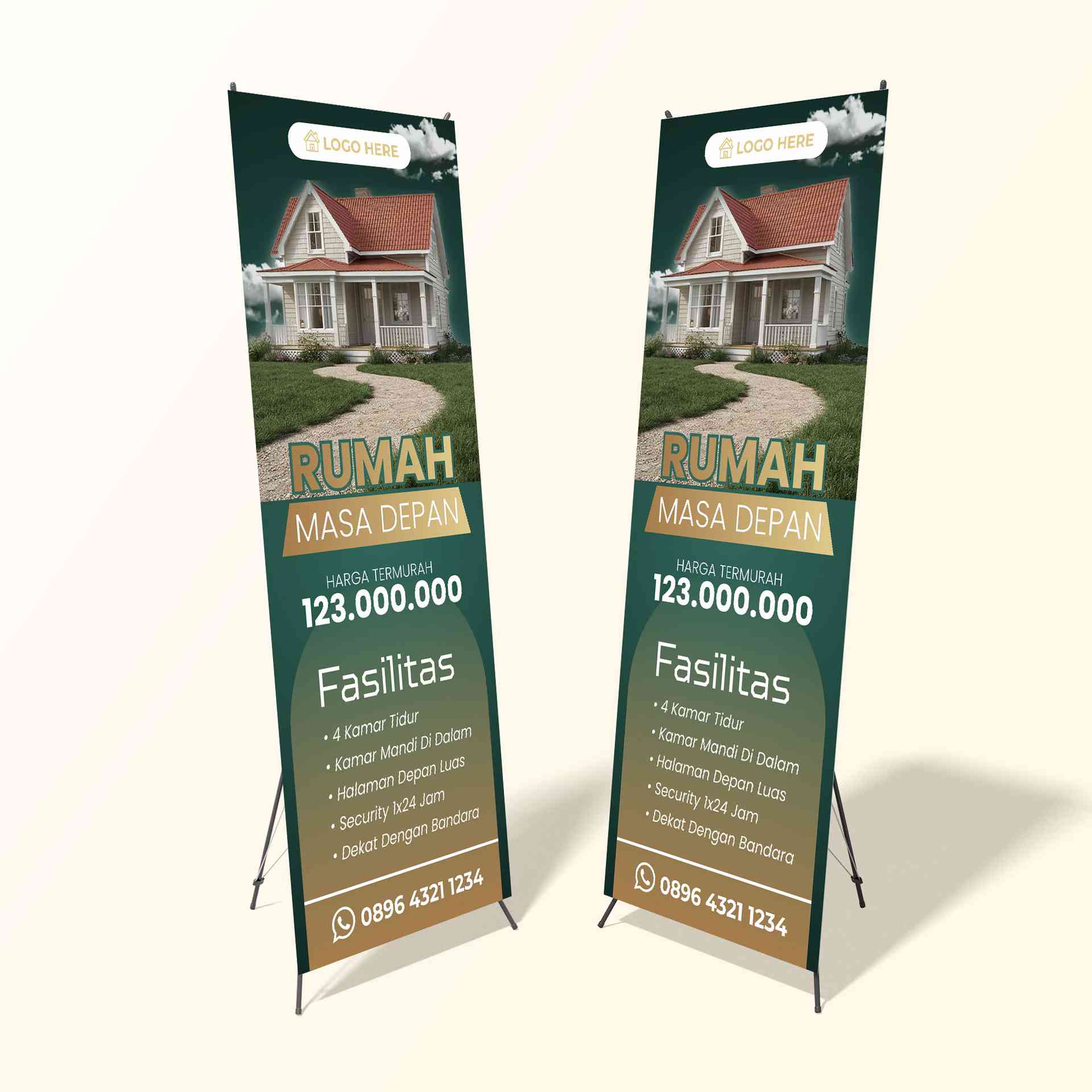 Banner dengan penawaran harga terjangkau untuk rumah masa depan seharga 123 juta. Menampilkan gambar rumah yang indah dengan fasilitas lengkap, sepert...