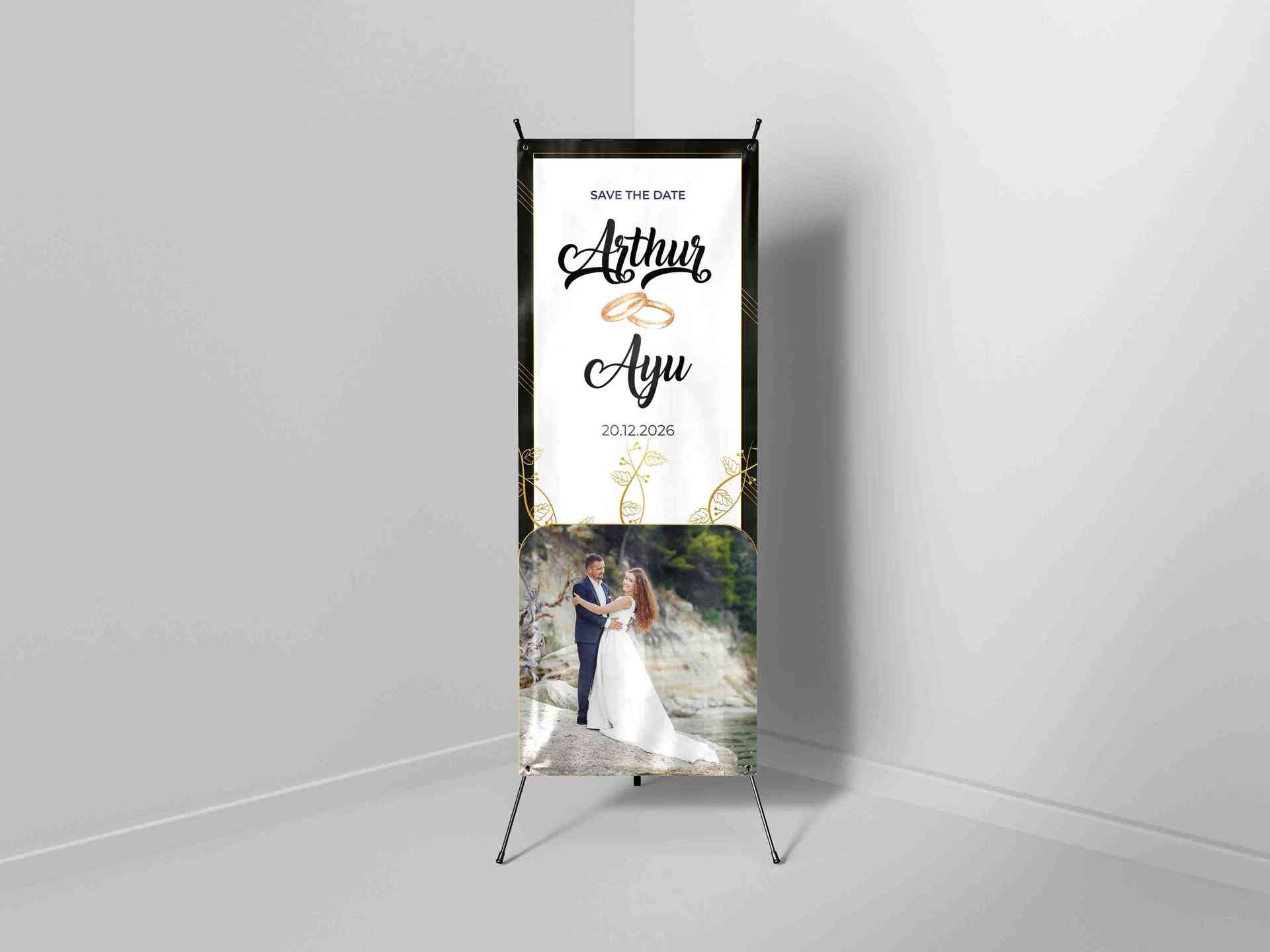 X-Banner ini didesain dengan nuansa minimalis yang elegan untuk pengumuman “Save The Date” acara pernikahan. Nama pasangan “Arthur & Ayu” ditampilkan dengan font kaligrafi yang anggun, dihiasi ilustrasi dua cincin emas yang menjadi simbol pernikahan. Tanggal acara “20.12.2026” tercetak jelas di bagian atas dengan penataan yang rapi. Elemen utama dari banner ini adalah bingkai foto berbentuk bulat di bagian bawah, yang menampilkan gambar romantis prewedding pasangan di alam terbuka. Latar putih bersih dan aksen daun emas di sudut-sudut desain memperkuat kesan mewah tanpa kesan berlebihan. Cocok dijadikan sebagai dekorasi venue pernikahan, meja penerima tamu, atau backdrop spot foto.