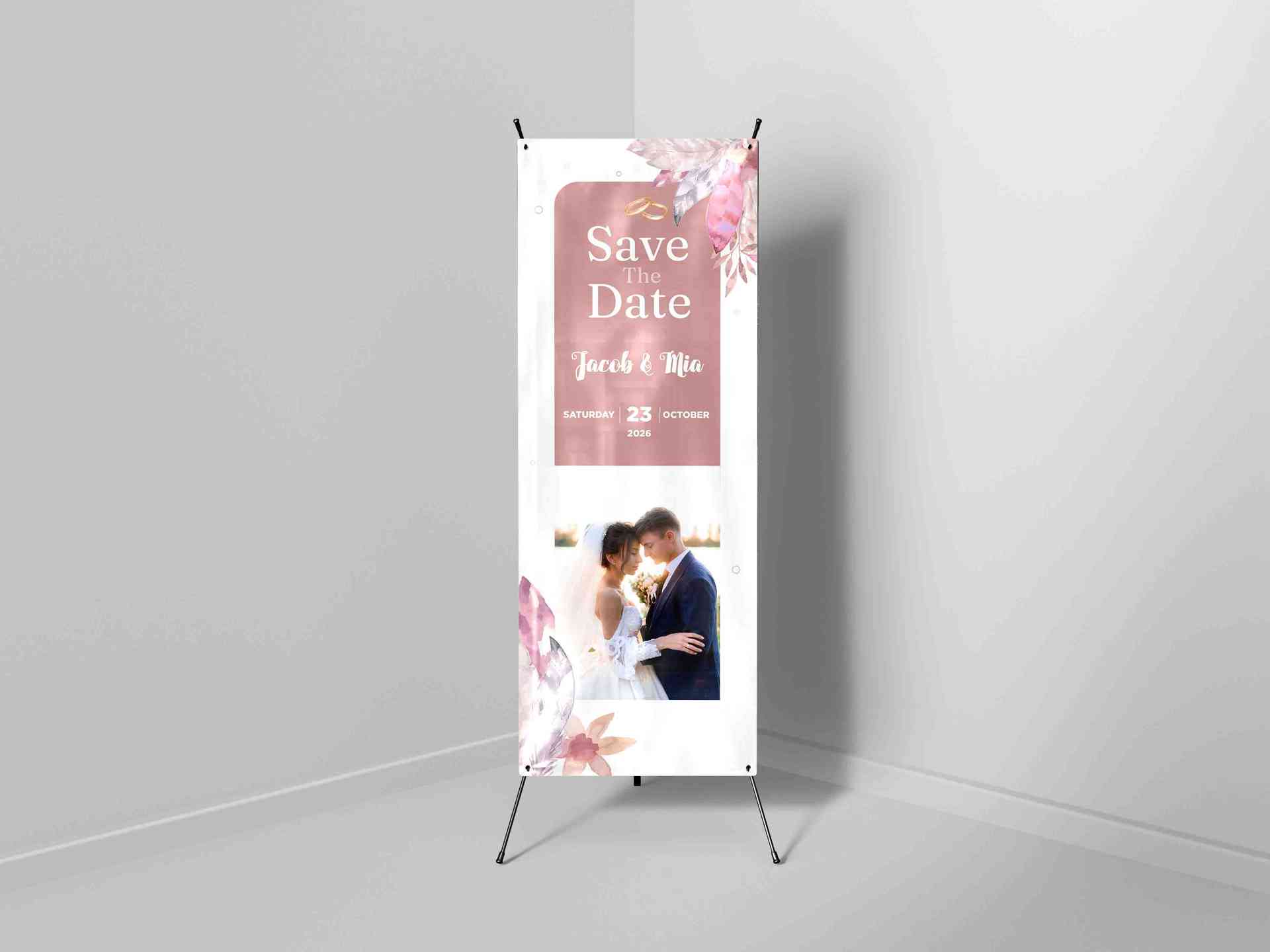 Desain X-Banner ini mengusung konsep "Save The Date" untuk pengumuman pernikahan, dengan komposisi layout yang elegan dan berkelas. Di bagian atas ter...
