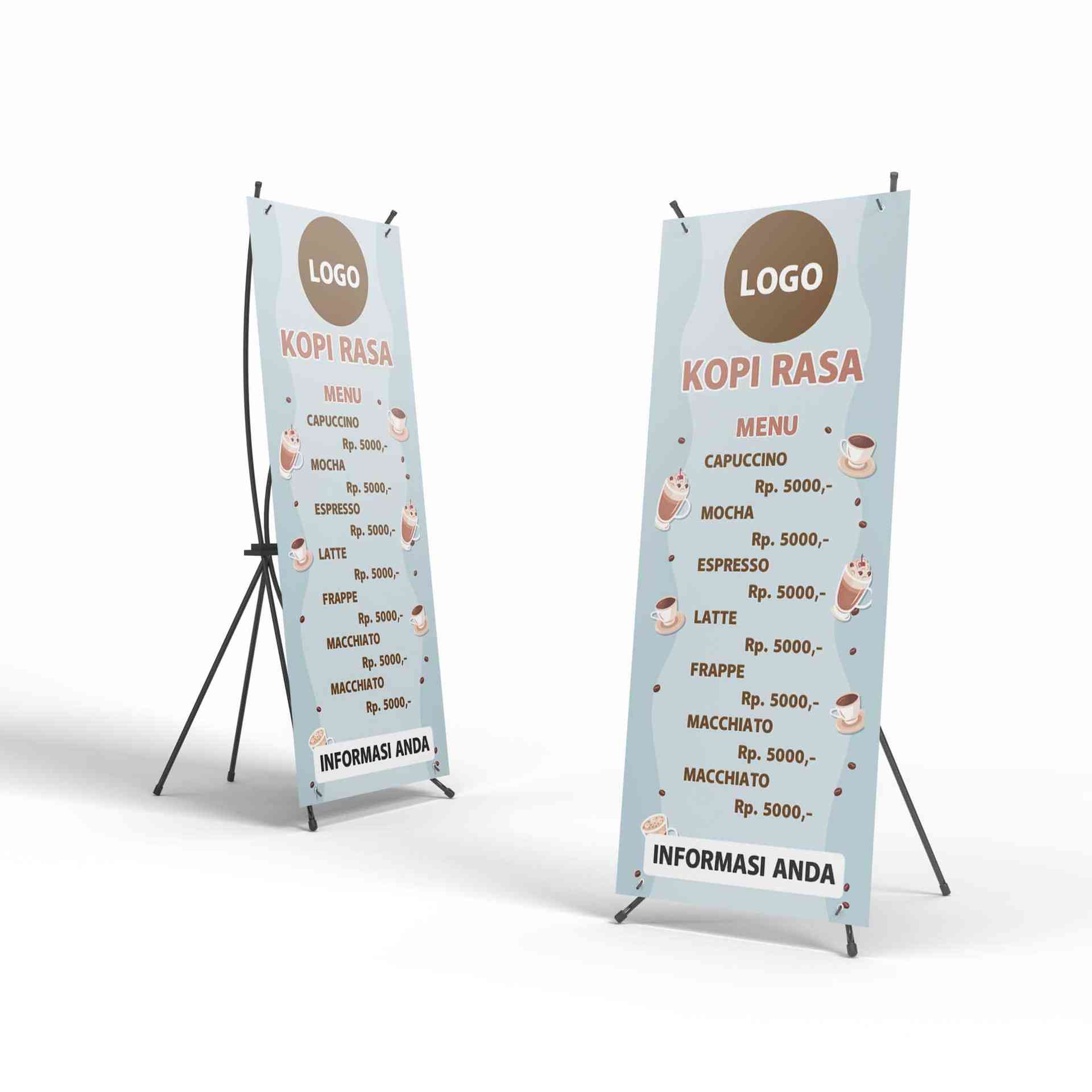 Deskripsi:Template ini adalah desain X-Banner menu kopi dengan nuansa ceria dan ringan, cocok untuk coffee shop, booth kopi, atau kedai kopi kecil den...