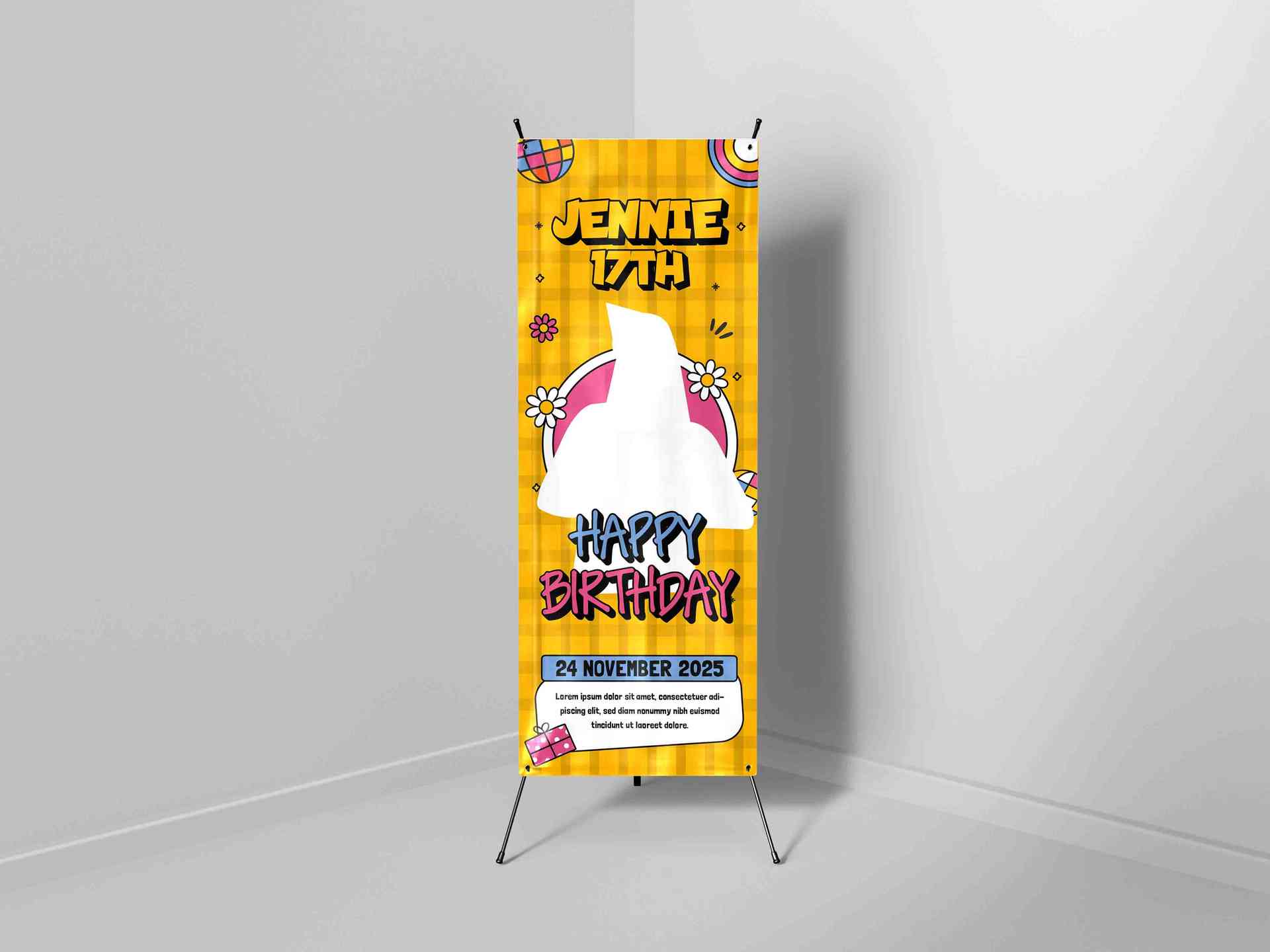 Desain X-banner ini dirancang untuk merayakan ulang tahun Jennie yang ke-17 dengan gaya pop art yang ceria dan penuh warna. Latar belakang kuning berm...