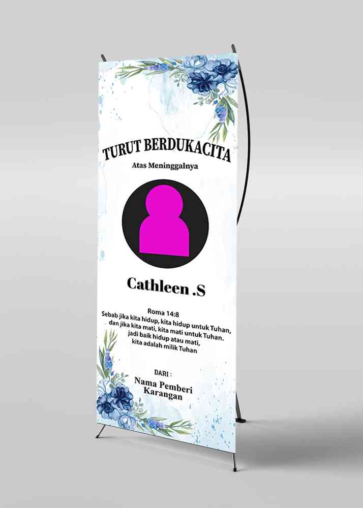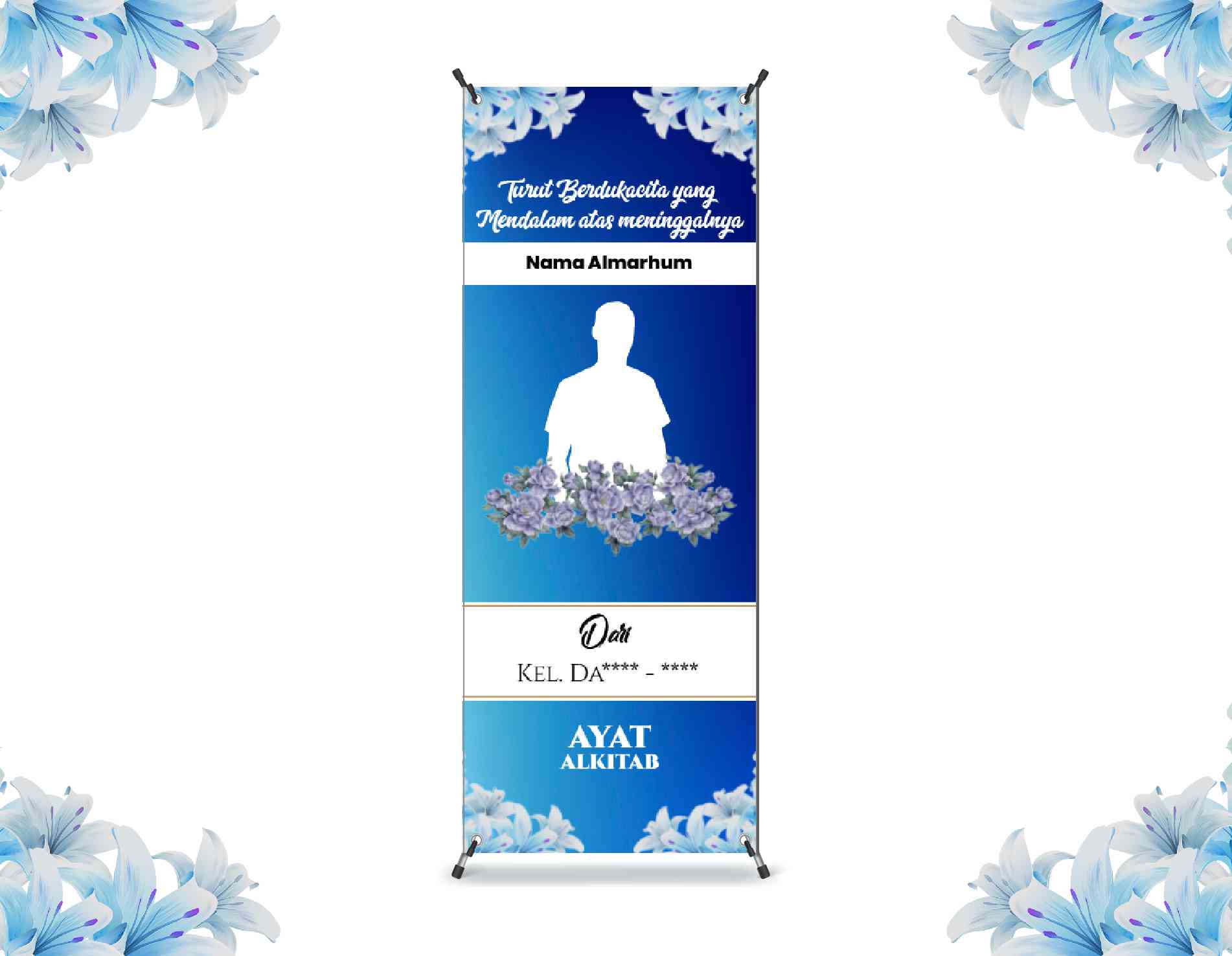 Banner duka cita berformat vertikal ini didominasi warna biru dengan aksen ornamen bunga putih di bagian atas dan bawah sebagai simbol ketulusan dan b...