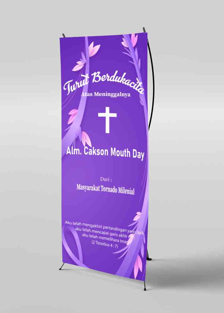 Banner duka dengan tema ungu ini dirancang dengan kesan yang elegan, penuh penghormatan, dan penuh ketenangan. Warna ungu dipilih karena melambangkan...