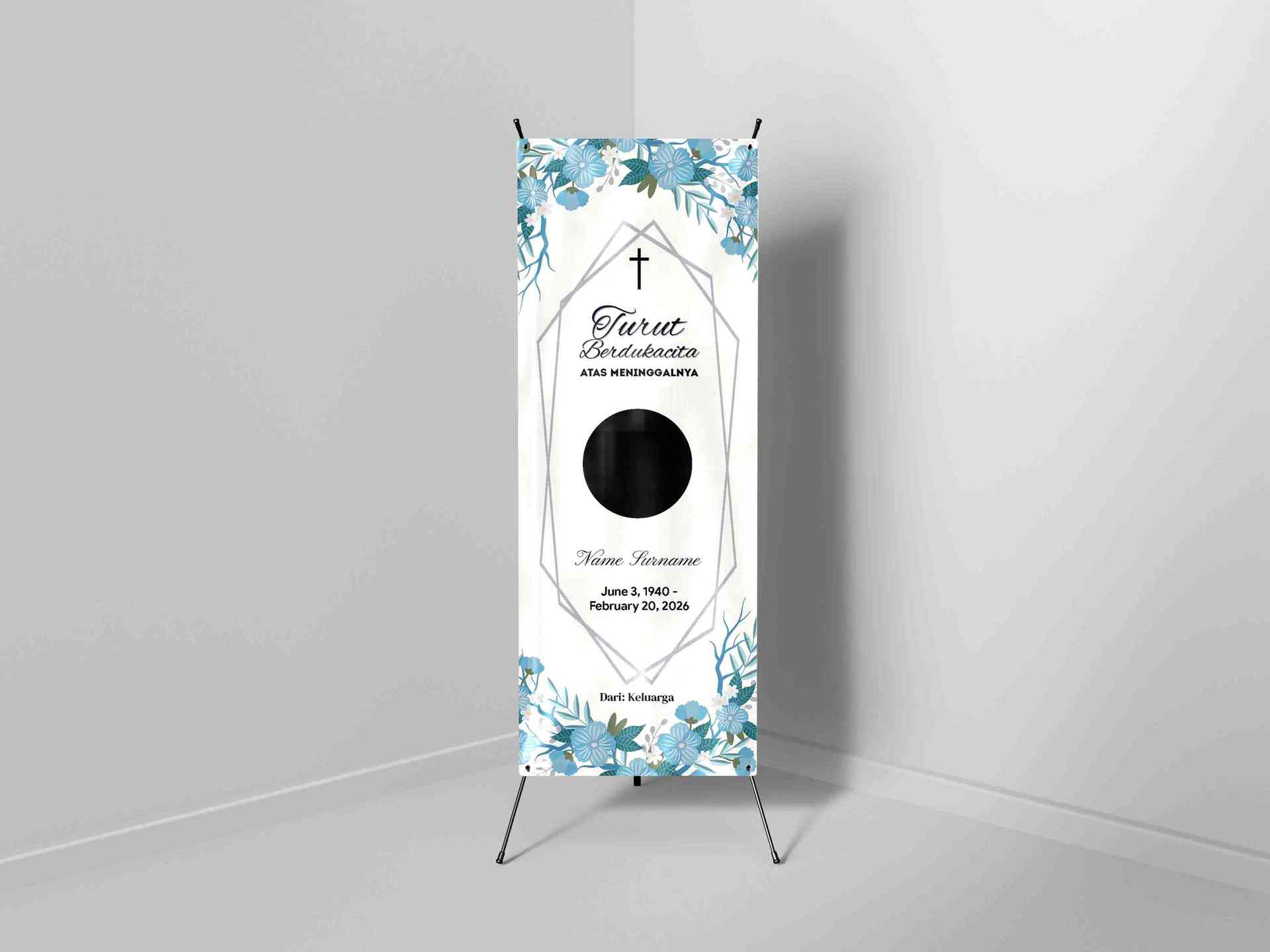 Cocok digunakan dalam acara pemakaman, misa requiem, atau peringatan hari wafat, banner ini menyampaikan belasungkawa dengan tampilan bersahaja namun penuh makna, memberikan penghormatan terakhir secara visual yang sopan dan menyentuh hati.