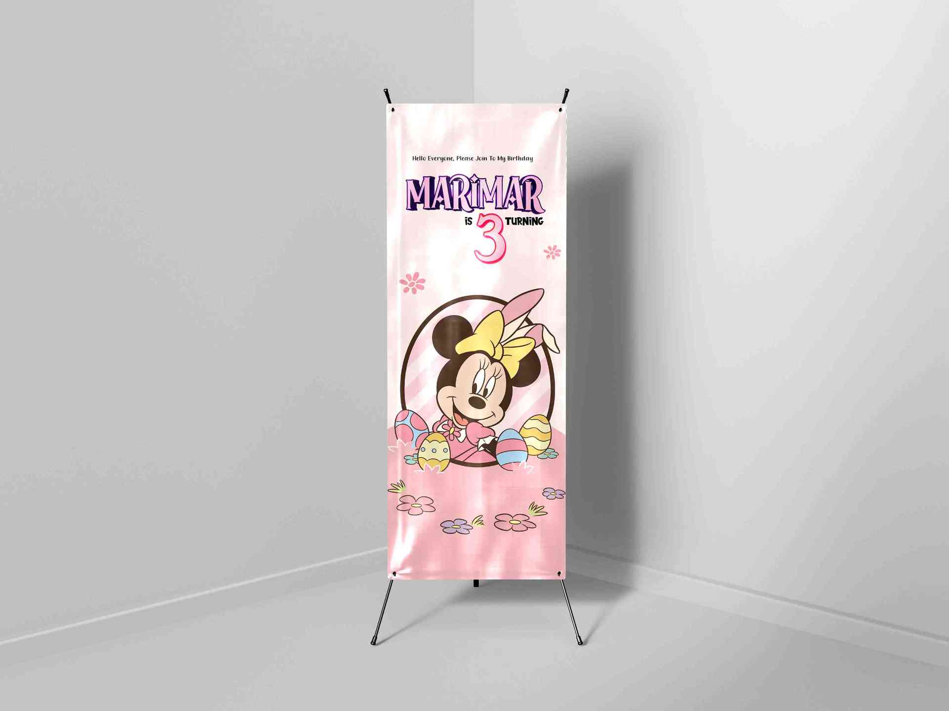 X-Banner ini menampilkan karakter Minnie Mouse dalam versi menggemaskan dengan sentuhan kostum bertema kelinci dan telur Paskah, memberikan kesan ceri...