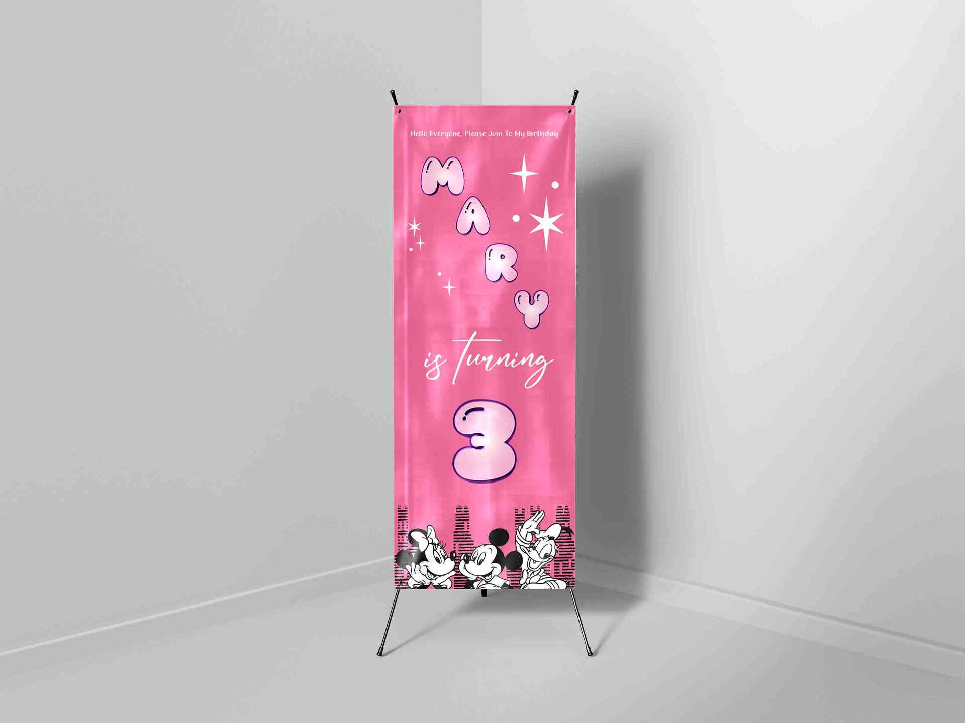 X-Banner ulang tahun ini menghadirkan nuansa ceria dan elegan dengan dominasi warna pink terang yang dihiasi tulisan “MARY is turning 3” dalam kombina...