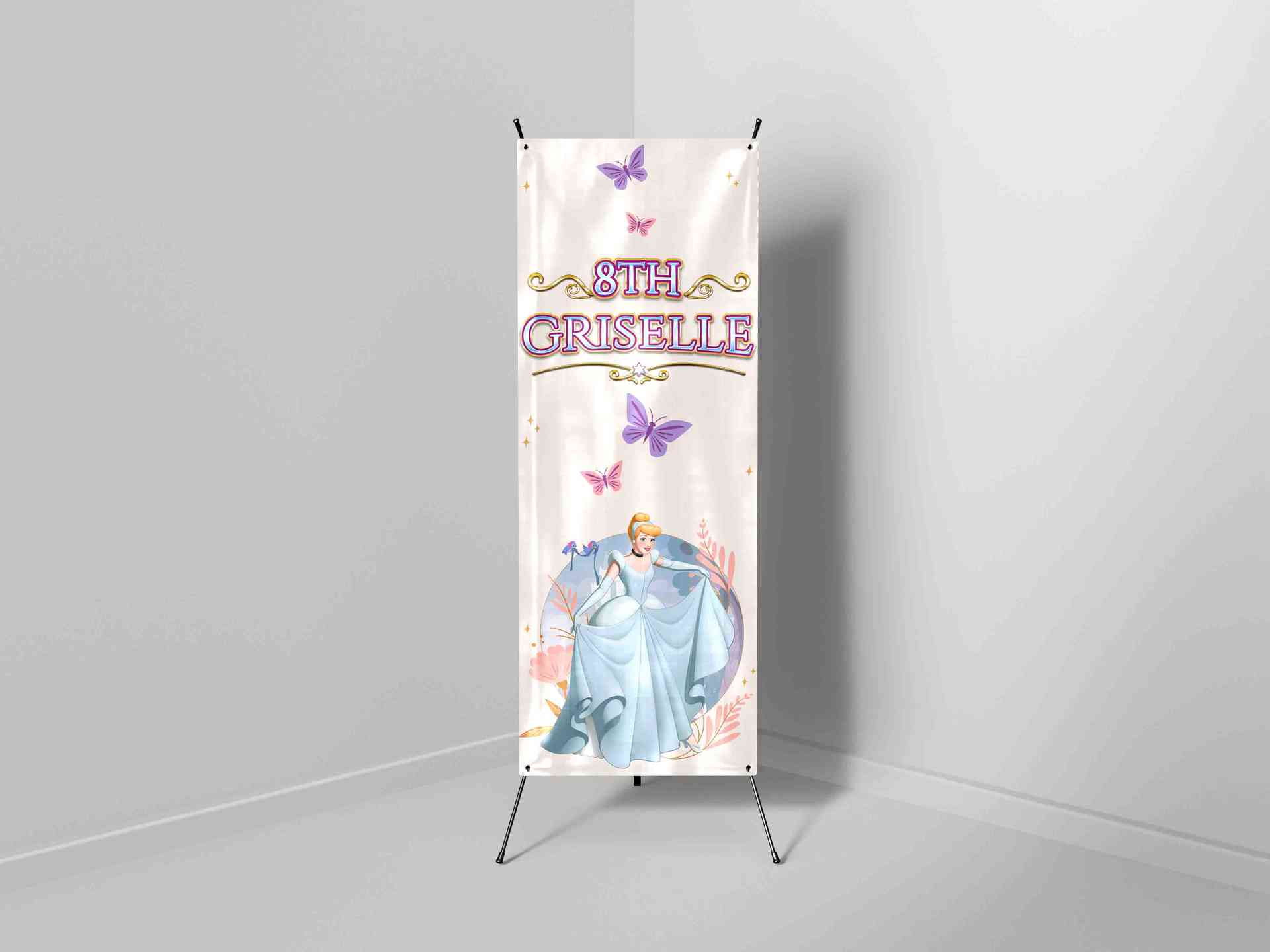 Desain X-Banner ini menampilkan nuansa elegan dan memukau dengan karakter klasik Cinderella yang tampil anggun dalam balutan gaun biru ikoniknya. Teks...