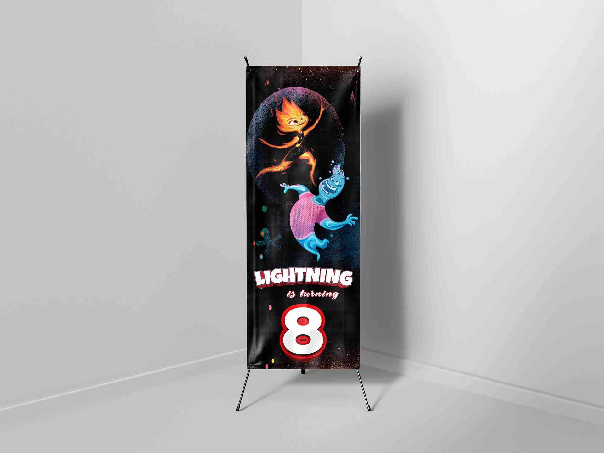 X-Banner ini menampilkan desain bertema fantasi dari film animasi Elemental, dengan karakter api dan air yang mencolok di tengah latar galaksi yang ge...