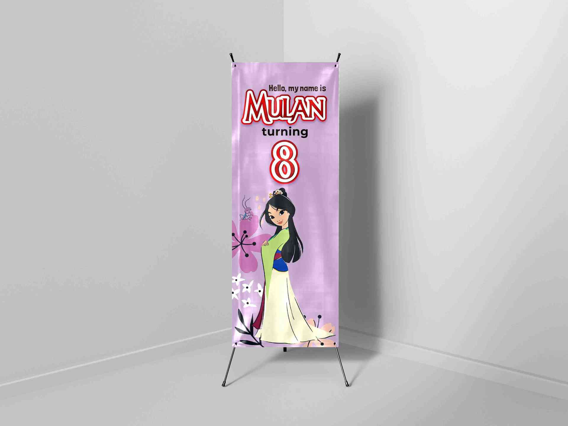 Desain X-Banner ini terinspirasi dari karakter Mulan yang kuat dan anggun, tampil dengan gaya ilustrasi klasik yang memikat. Latar berwarna ungu lembu...