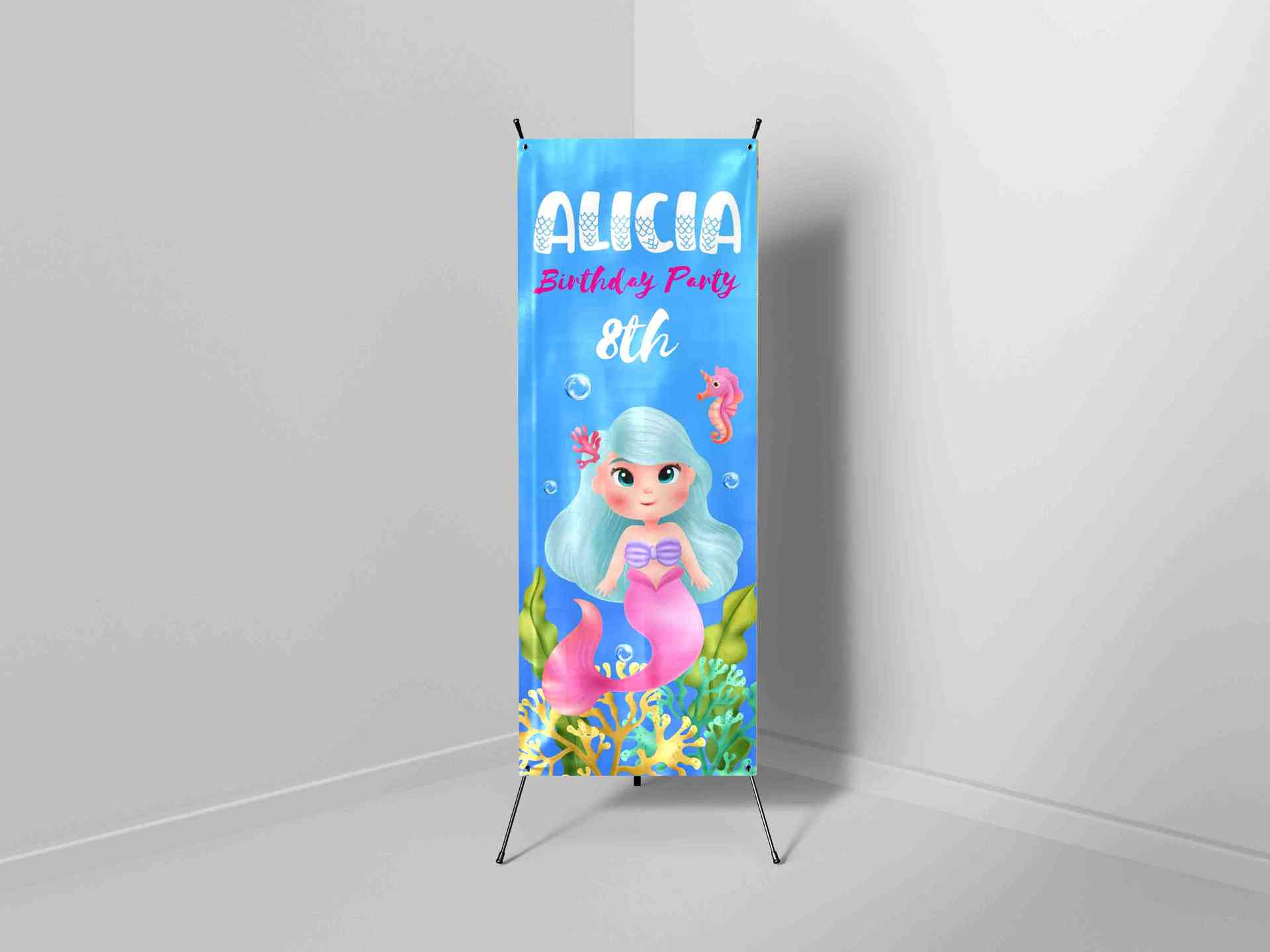 X-Banner ini didesain khusus untuk merayakan ulang tahun Alicia yang ke-8 dengan tema dunia bawah laut yang memukau. Menampilkan dua karakter putri duyung lucu dengan warna rambut ungu dan coklat, lengkap dengan ilustrasi teman-teman laut seperti ikan kecil, gurita, bintang laut, dan terumbu karang berwarna-warni. Tulisan “Alicia Birthday Party” berada di tengah dengan tipografi campuran pink dan oranye, yang memberikan kesan ceria dan feminin. Background bergradasi biru lembut menambah kesan air laut yang menenangkan, menjadikan banner ini sangat cocok untuk dekorasi pesta ulang tahun anak perempuan yang menyukai kisah putri duyung dan dunia laut ajaib.