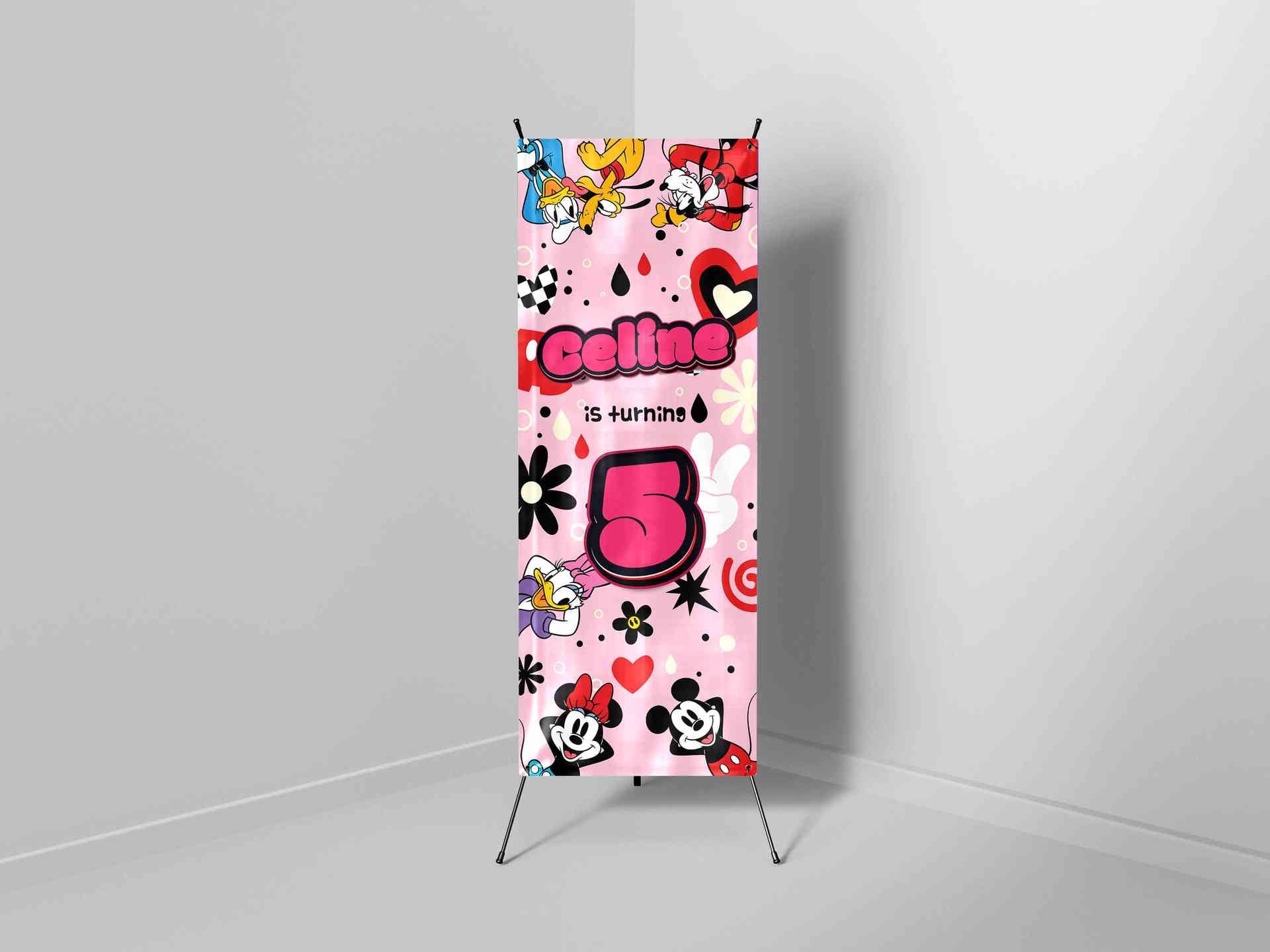 X-banner ulang tahun ini didesain dengan konsep kartun penuh warna yang menggambarkan keceriaan masa kecil. Dominasi warna pink pastel menciptakan nua...