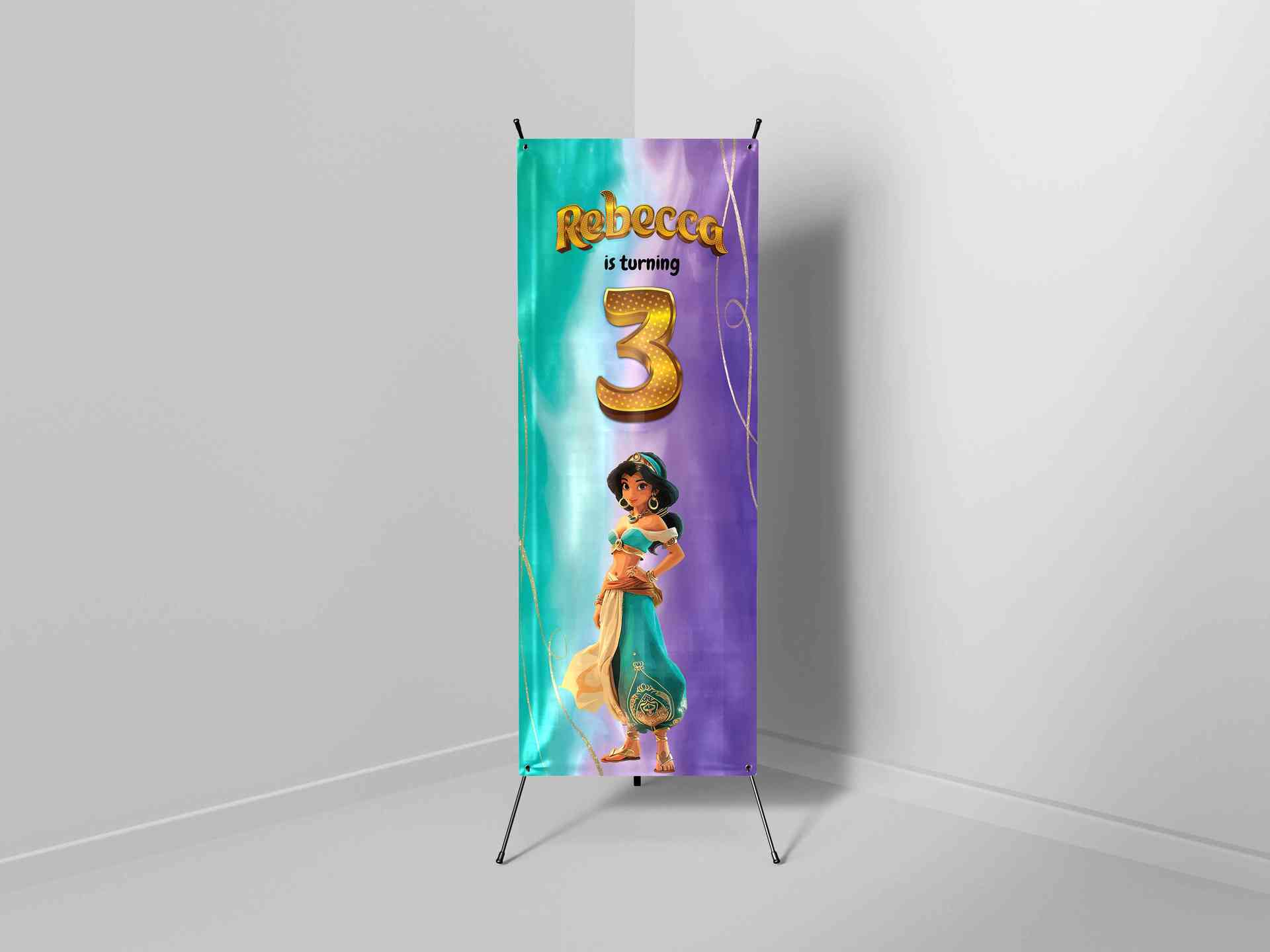 Banner ulang tahun ini mengangkat tema Arabian princess dengan nuansa magis dan mewah yang sangat cocok untuk anak perempuan berusia 3 tahun. Nama “Re...